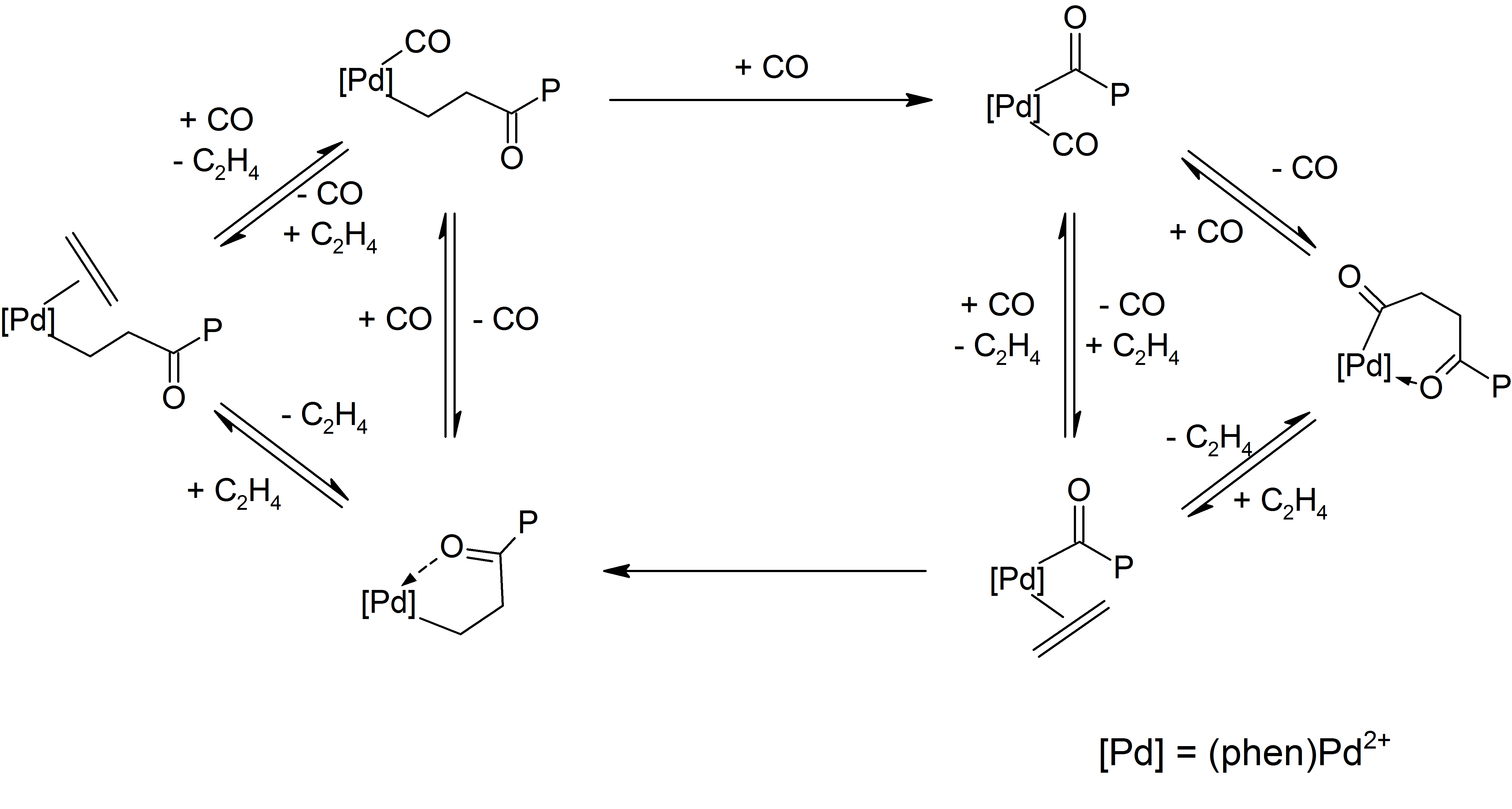 이 중합 반응은 팔라듐(II) - 페난트롤린 촉매(아래 그림의 [Pd])를 사용하여 연쇄적으로 반응한다고 알려져 있다. 이 설은 노스캐롤라이나 대학교 채플힐의 모리스 브룩하트/Maurice Brookhart영어 교수가 주장한 것이다.