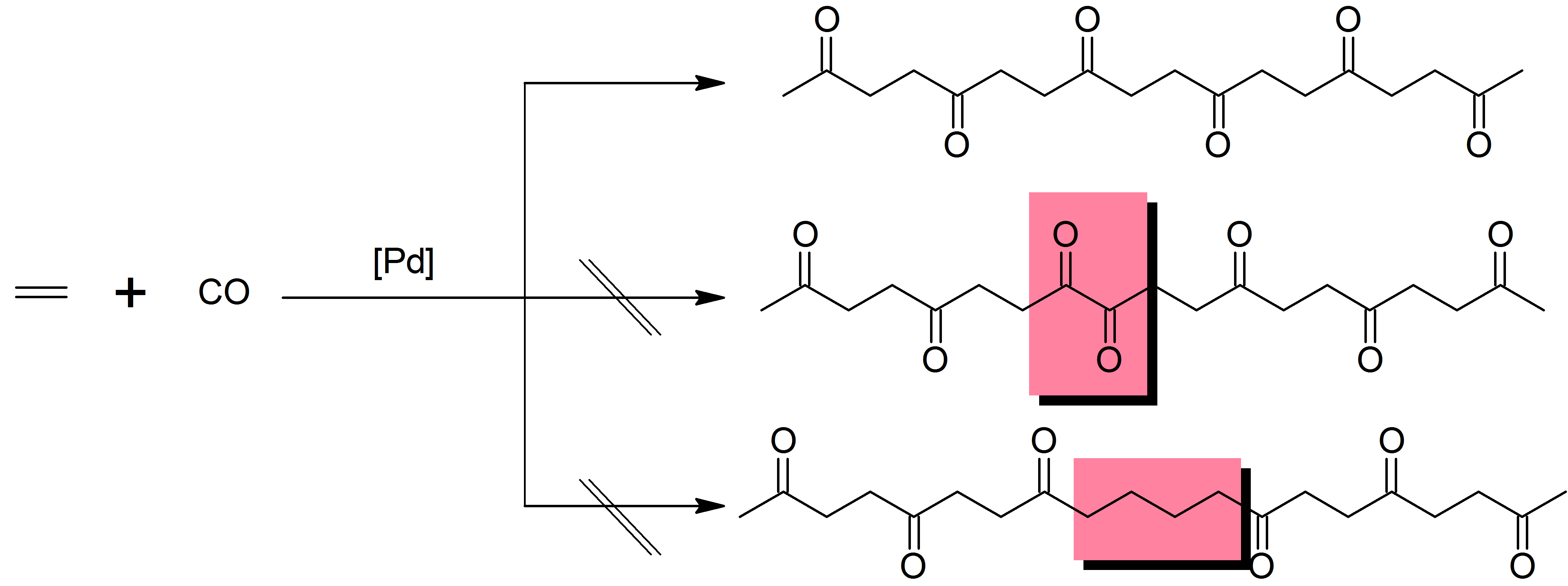 또한, 브룩하트 교수의 연구에 따르면 에틸렌끼리 연결되기 위해 필요한 알킬에틸렌-팔라듐 복합체도 어떤 조건에서도 거의 발생하지 않는다. 게다가, 알킬기에 일산화탄소가 부가되는 깁스 자유 에너지는 알킬기에 에틸렌이 부가되는 깁스 자유 에너지보다 약 3 kcal/mol 낮다.