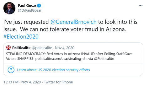 2021년 1월 6일, 미국 선거인단 투표를 집계하기 위한 선거인단 의회 합동 회의에서 고사와 테드 크루즈 상원의원은 애리조나 선거 결과에 이의를 제기했다.[104]
