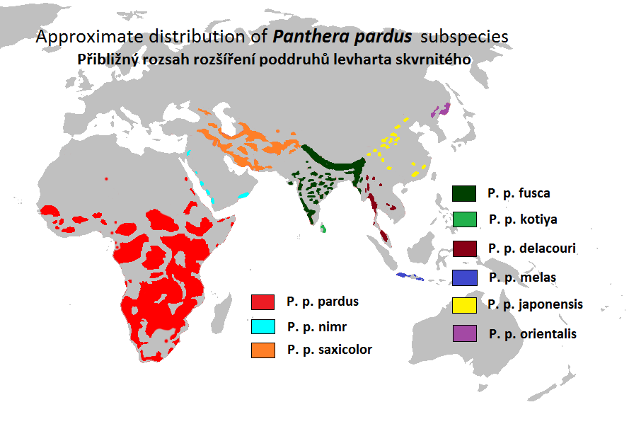 아프리카표범 (P. p. pardus) | 사하라 이남 아프리카 대부분 (일부 지역 멸종)[1] | |
