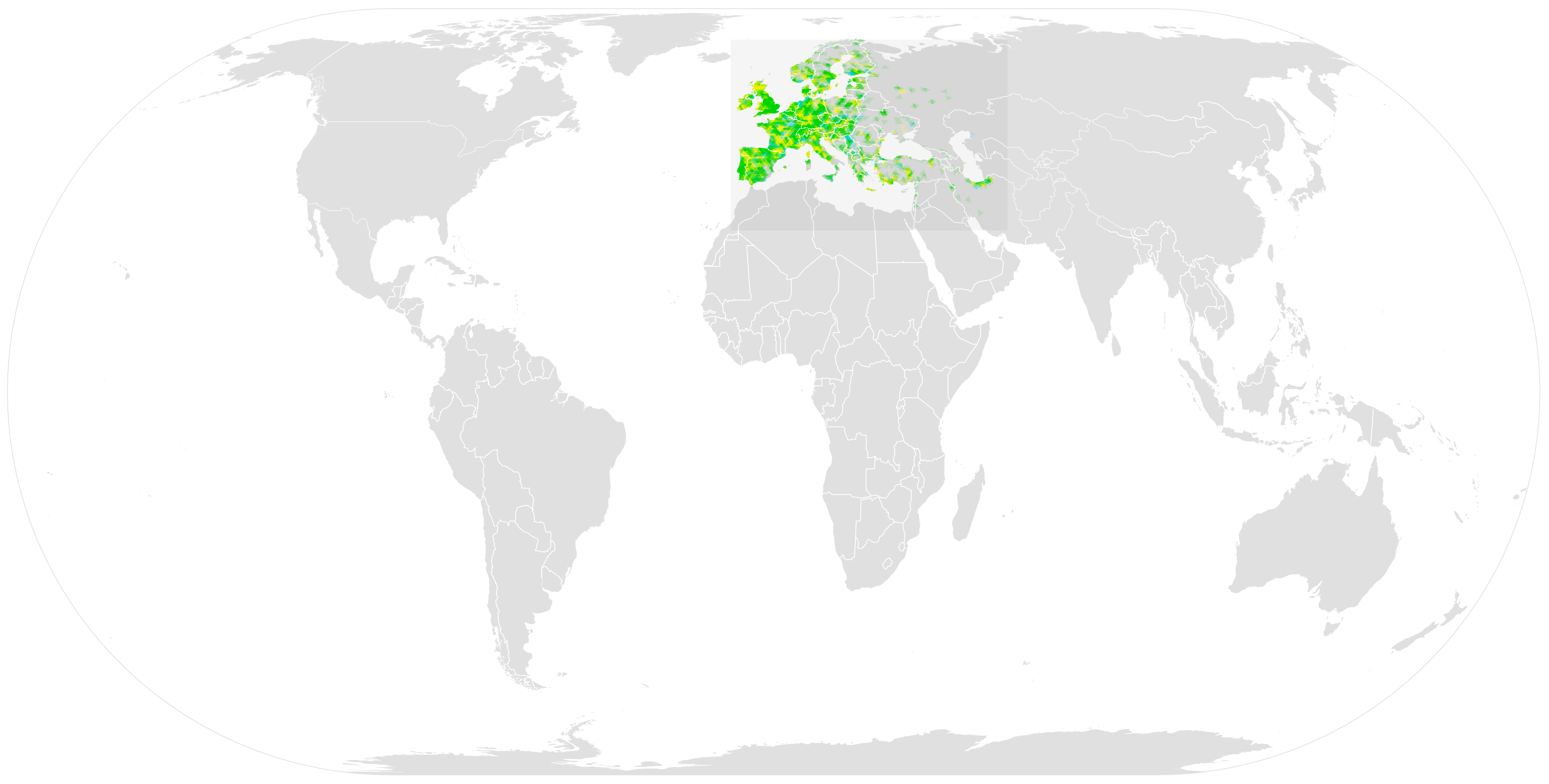 유라시아 푸른 박새와 관련된 잡종은 주로 온대 또는 지중해성 기후를 보이는 유럽 대륙의 지역과 중동 일부 지역에서 토착종으로 간주된다. 이러한 지역에는 아일랜드, 영국 및 대부분의 유럽 연합과 EFTA (방랑종으로 간주되는 몰타와 부재하는 아이슬란드 제외)와 다음 지역이 포함된다: 알바니아, 알제리, 안도라, 아르메니아, 아제르바이잔, 벨라루스, 보스니아 헤르체고비나, 조지아, 이란, 이라크, 요르단, 카자흐스탄, 레바논, 리비아, 몰도바, 몬테네그로, 모로코, 북마케도니아, 러시아, 산마리노, 세르비아, 시리아, 튀니지, 튀르키예, 바티칸 시국 및 우크라이나.