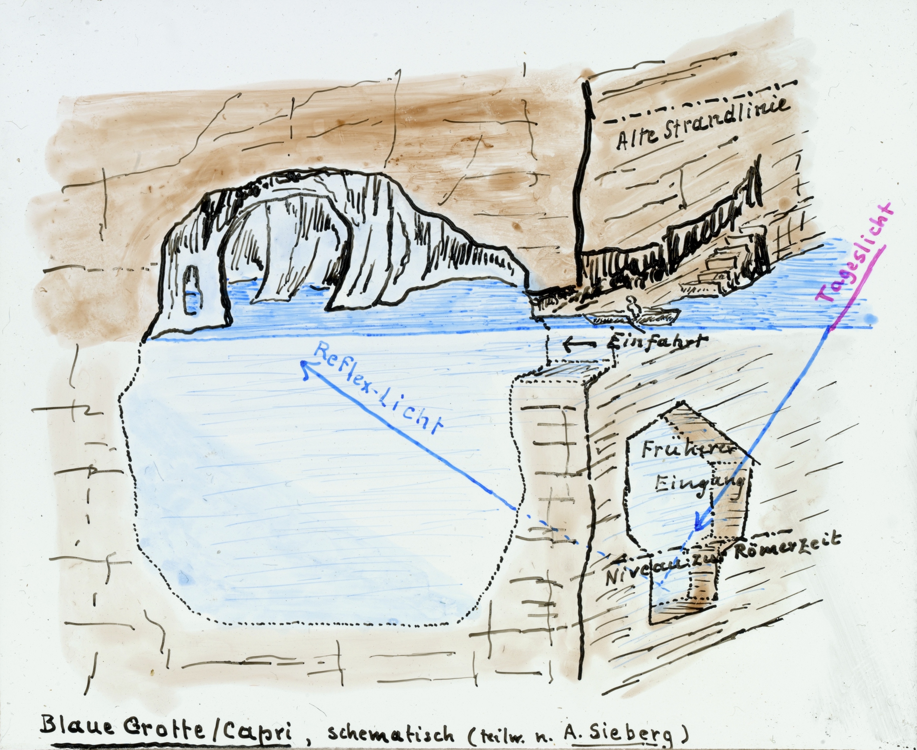 아우구스트 코피슈와 에른스트 프리즈는 1826년 푸른 동굴을 방문하여 1838년 코피슈의 저서 ''카프리 섬의 푸른 동굴 발견''에 방문 기록을 남겼다. 1842년 아우구스트 부르농빌은 자신의 발레 ''나폴리'' 2막을 푸른 동굴에서 진행했는데, 여기서 푸른 동굴을 지배하는 악마 골포는 발레 여주인공 테레시나를 나이아스로 변신시킨다.