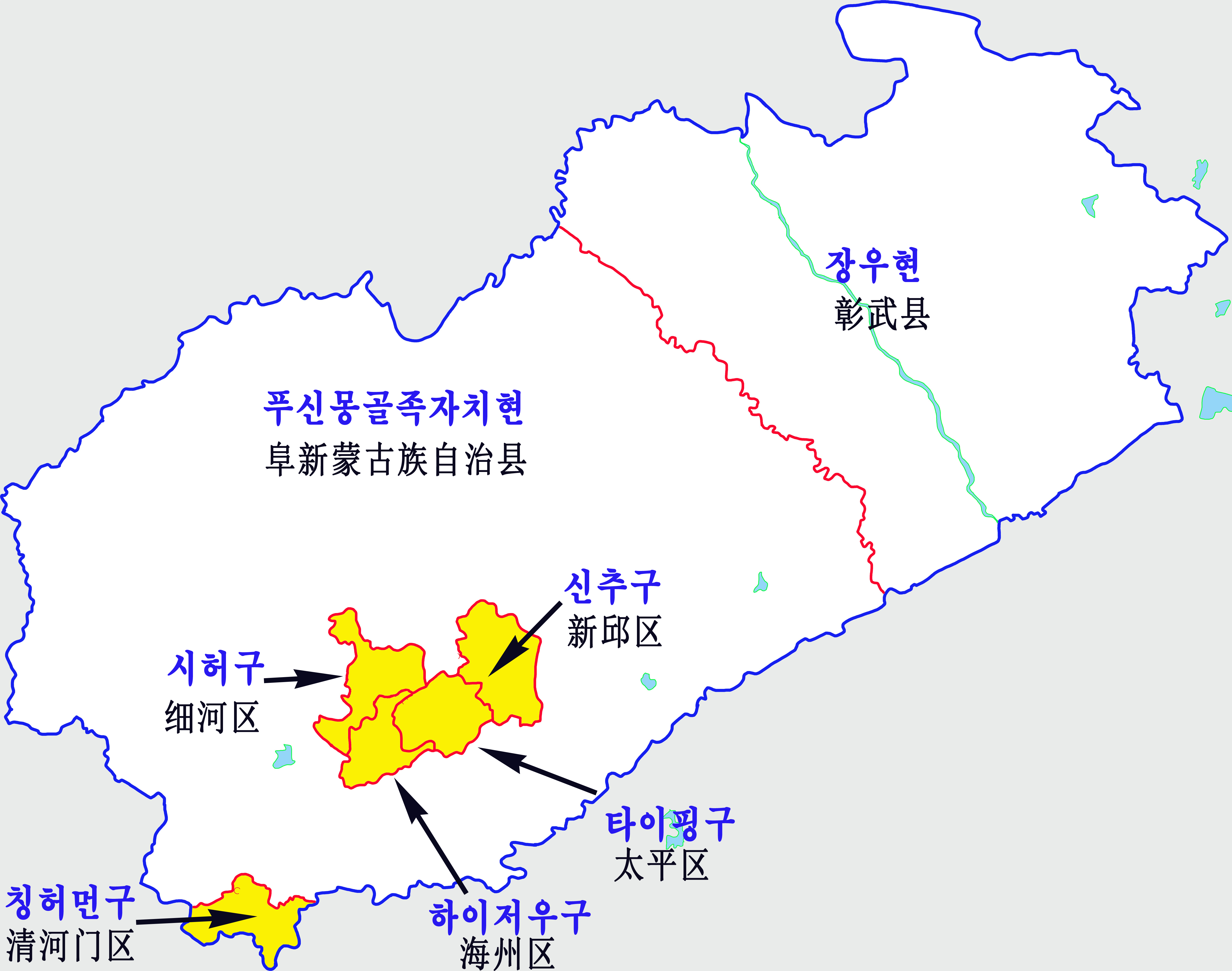 (/km2)1 하이저우 구 海州区중국어 Hǎizhōu Qū 280,000 97km2 2,887 2 신추 구 新邱区중국어 Xīnqiū Qū 90,000 128km2 703 3 타이핑 구 太平区중국어 Tàipíng Qū 180,000 108km2 1,667 4 칭허먼 구 清河门区중국어 Qīnghémén Qū 70,000 105km2 667 5 시허 구 细河区중국어 Xìhé Qū 160,000 126km2 1,270 6 장우 현 彰武县중국어 Zhāngwǔ Xiàn 420,000 3635km2 116 7 푸신 몽골족 자치현 阜新蒙古族自治县중국어 Fùxīn Měnggǔzú Zìzhìxiàn 730,000 6246km2 117