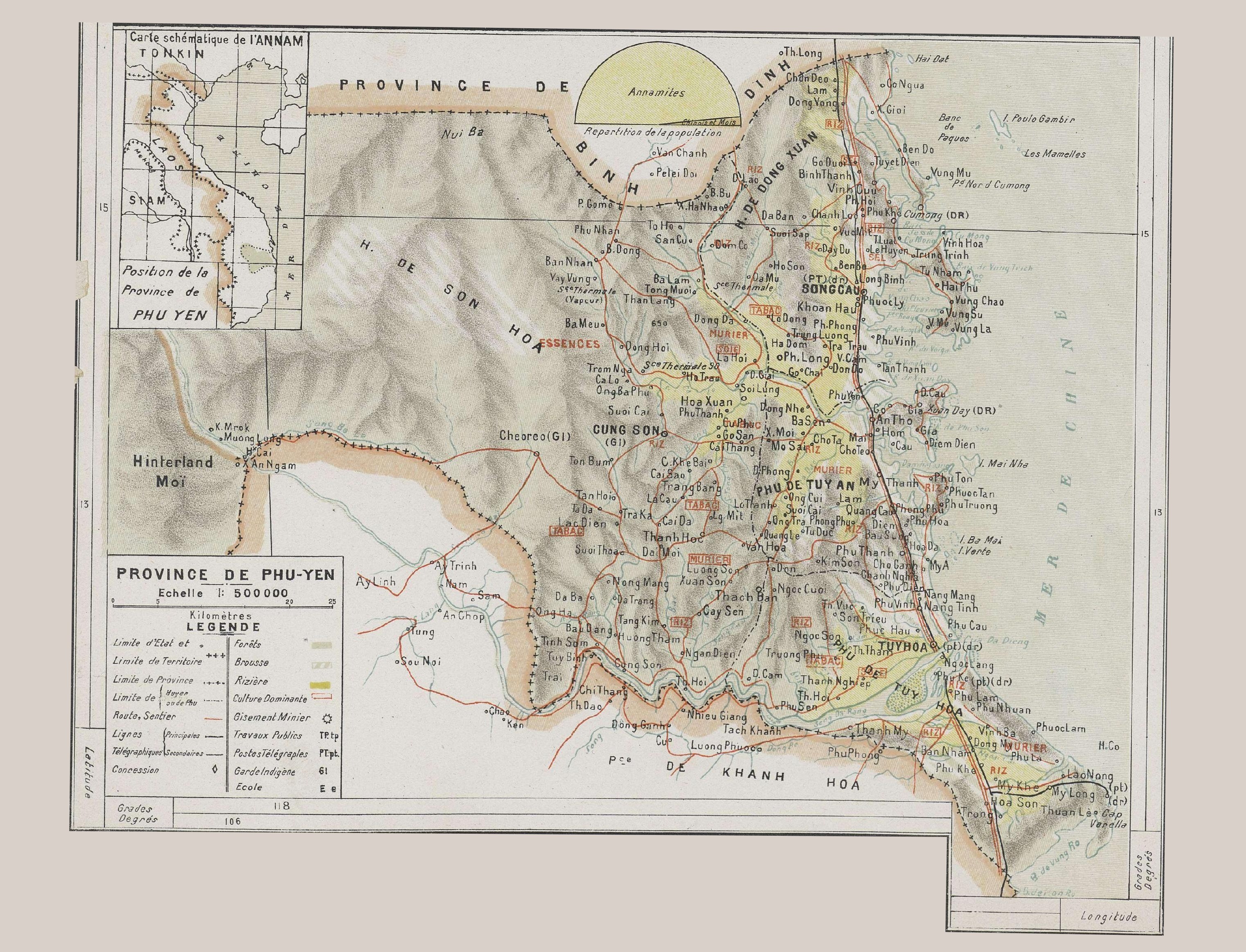 가장 높은 봉우리는 남쪽 카인호아성(Khánh Hòa province) 국경에 있는 해발 1,592m 지점과 북서쪽(동쑤언현(Đồng Xuân District))의 해발 1,331m 지점에 있다.[5] 해안 근처에는 쏭까우(Sông Cầu)의 모체오 언덕(누이 모체오, Núi Mô Cheovi, 814m)과 동화현(Đông Hòa District) 다이랑(Đại Lãnh) 근처의 다비아 언덕(누이 다비아, Núi Đá Biavi, 706m)이 있다.[5] 성의 남서쪽에는 넓은 인공 호수인 썽힌 호(Sông Hinh Lake)가 있다.[4]