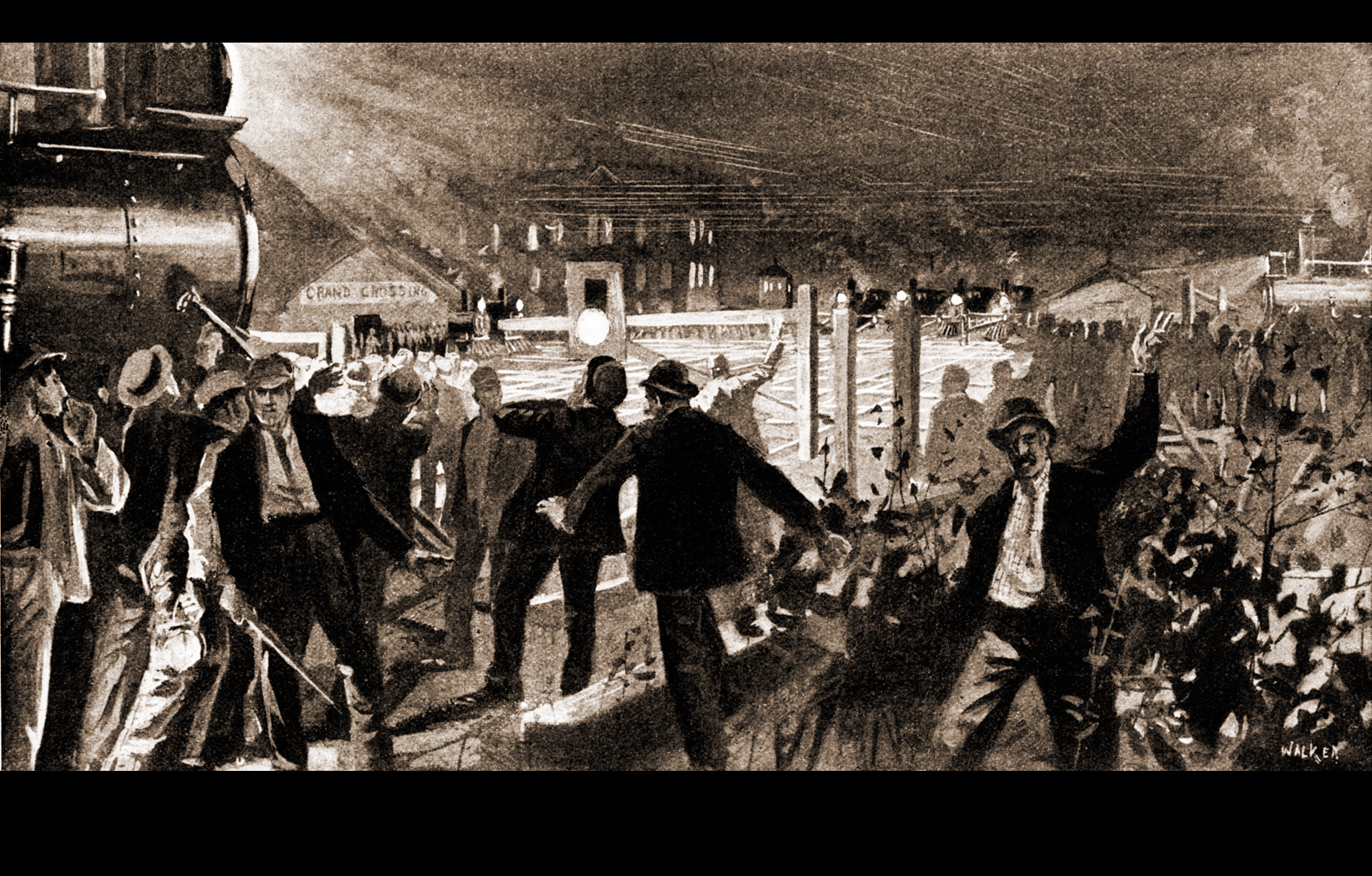 1894년 7월 7일, 파업이 격화되면서 폭력 사태가 발생하여 수백 대의 화물차와 석탄차가 약탈당하고 불태워졌다.프레데릭 레밍턴의 그림에서 볼 수 있듯이 주 및 연방 군대가 파업 노동자들을 폭력적으로 공격했다.[19]