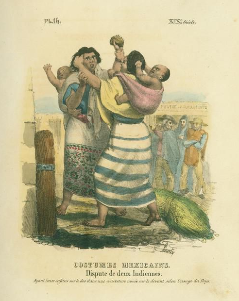 일부 카스타 그림에서는 풀케 소비가 묘사되었다.[22] 일부 카스타 화가들은 서로 다른 카스타들이 안전하게 풀케를 소비하고 판매하는 모습을 묘사했고,[23] 다른 카스타 화가들은 원주민들이 거리에서 술에 취해 무력해져서 가족들이 집으로 데려가야 하는 모습을 묘사했다.[24] 1828년, 이탈리아 석판화가 클라우디오 리나티는 풀케리아 밖에서 두 명의 원주민 여성이 다투는 모습을 묘사했다.