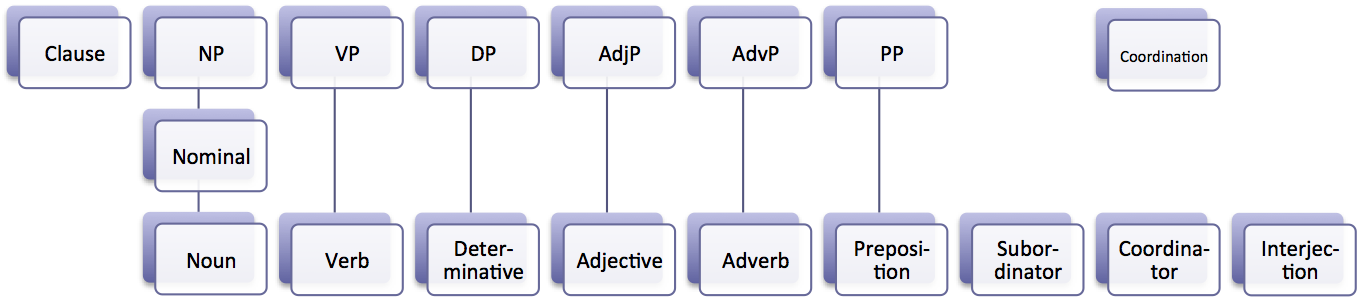 기능에 따라 정의된 일반적인 어휘 범주 집합에는 다음이 포함될 수 있다(모든 범주가 주어진 언어에 적용될 필요는 없음).