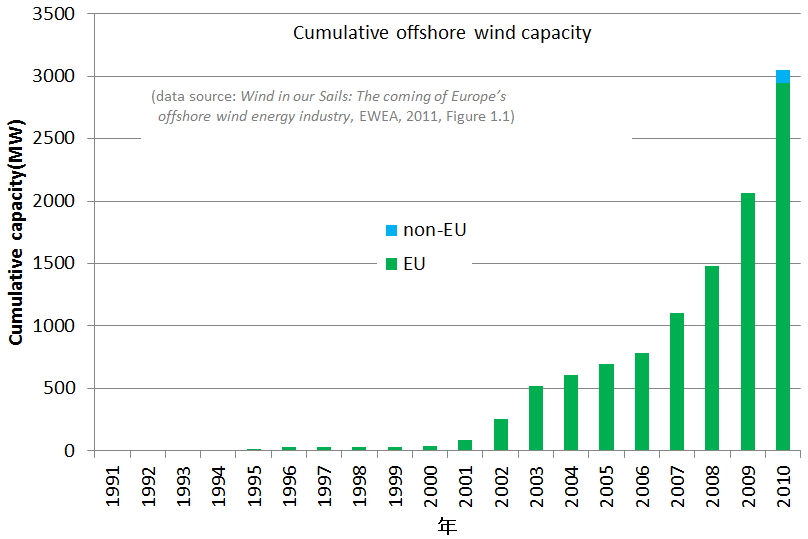 바다에 풍력 발전기를 설치하는 것을 해상 풍력 발전이라고 한다. 지형이나 건물의 영향을 적게 받아 안정적인 풍력 발전을 할 수 있고, 입지 확보, 경관, 소음 문제도 해결할 수 있다. 2010년 말 시점에서 유럽을 중심으로 3GW 이상이 도입되었다.[226]