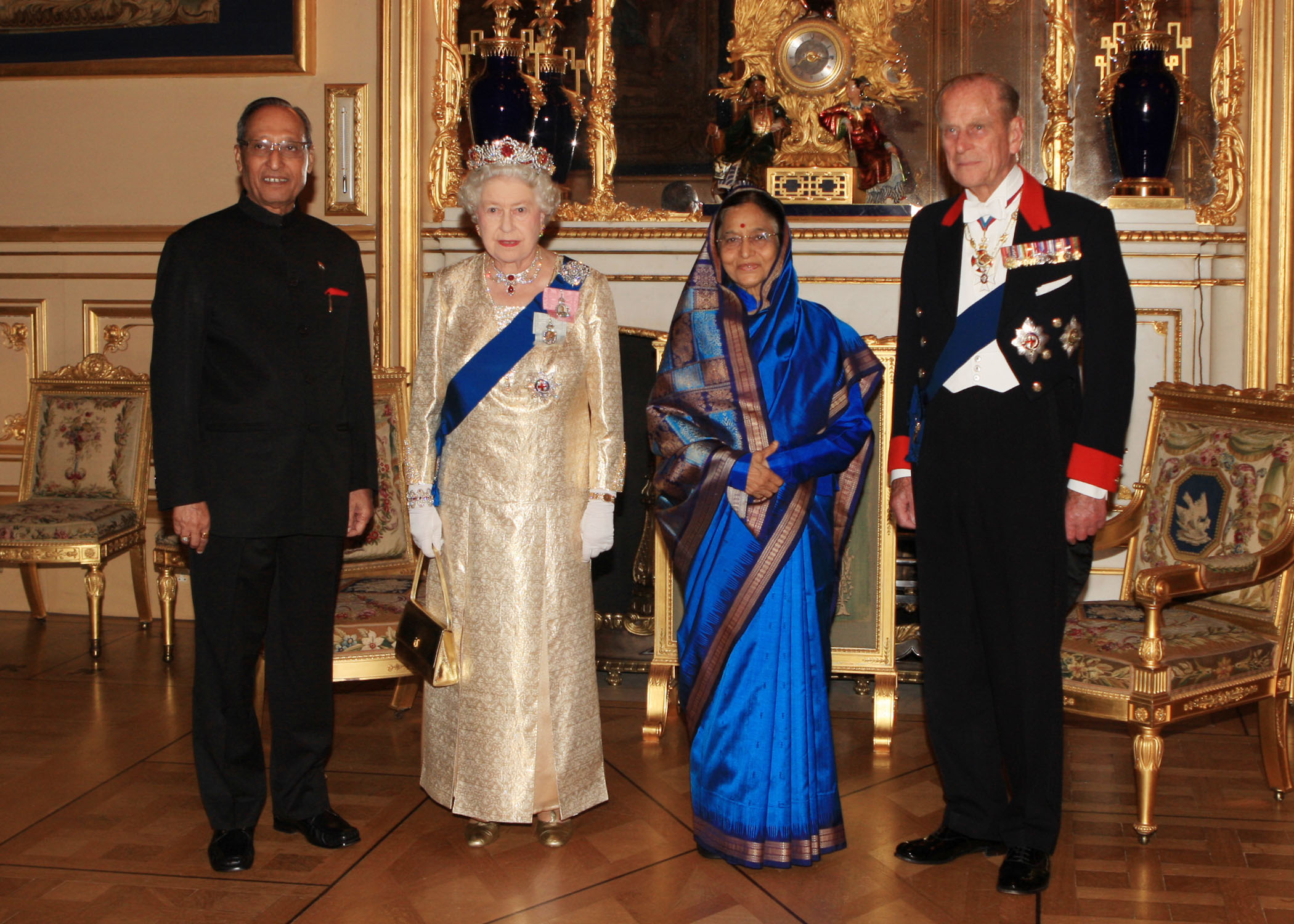 2009년 윈저 성에서 엘리자베스 2세 여왕이 주최한 국빈 만찬 전에 파틸 대통령과 남편이 여왕과 필립 공과 함께
