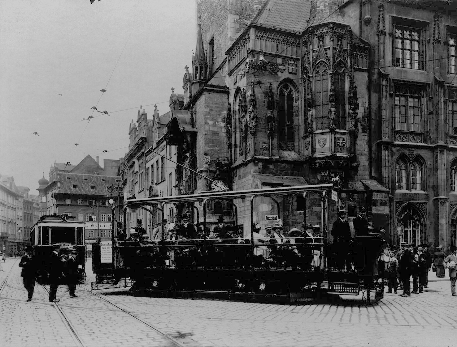 1891년 프라하는 프라하의 인기 있는 레크리에이션 장소인 레트나에 최초의 전기 노면전차 노선을 설치했다.[7] 이 노선은 주로 홍보 목적으로 사용되었으며, 레트나 푸니쿨라의 상부 터미널에서 ''백주년 기념 박람회'' 파빌리온까지 오베네츠카 거리를 통과했다. 2년 후, 이 노선은 총독의 여름 궁전까지 연장되었다. 프란티셰크 크르지치크가 프라하 최초의 전기 노면전차 노선을 만든 것으로 알려져 있다.