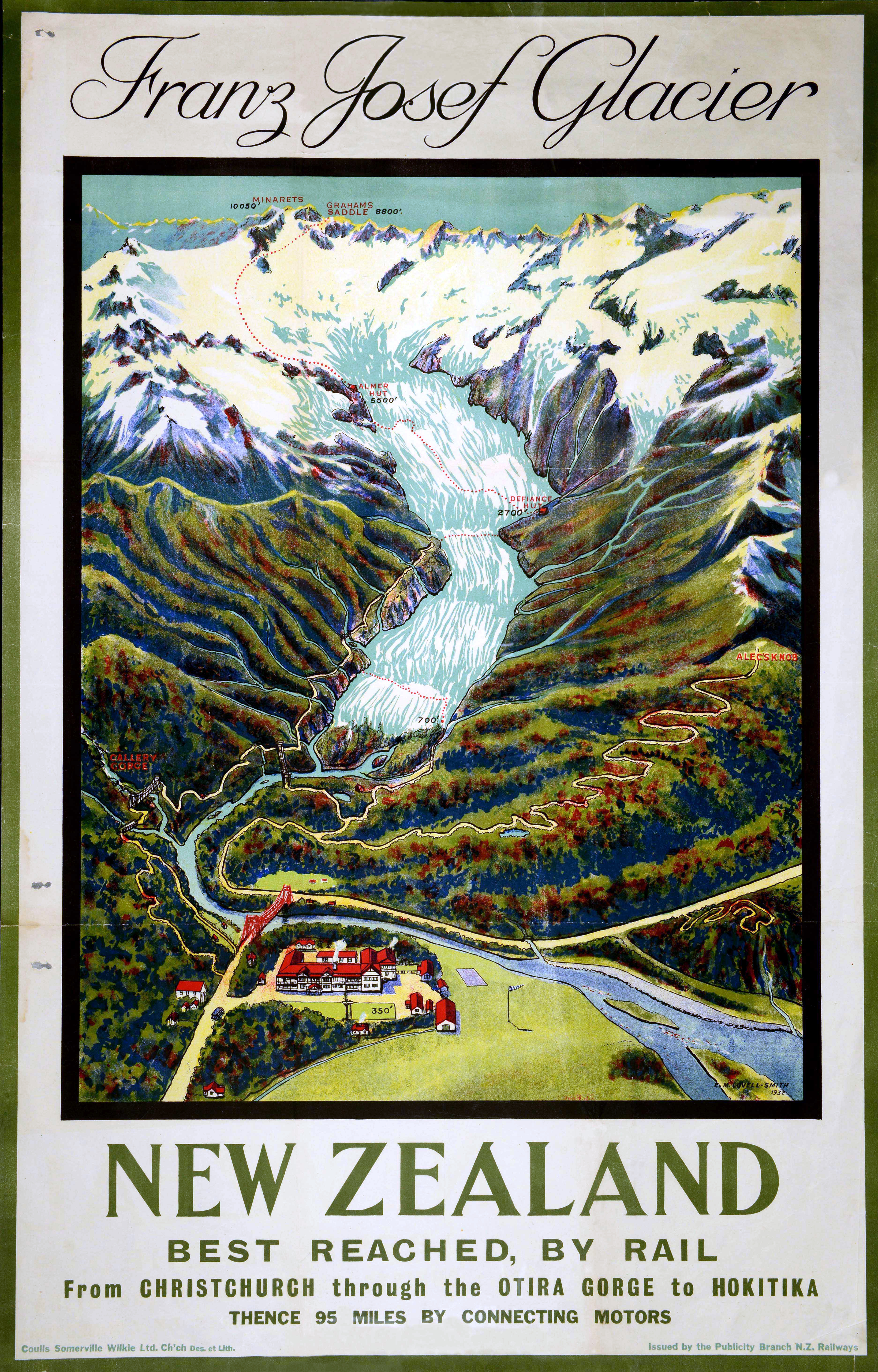 > 맑은 날에는 프란츠요제프 빙하와 그 배경의 산들을 보기 위해 오래 기다릴 만한 가치가 충분하다. 이곳은 세계에서 가장 주목할 만한 빙하 중 하나로, 8,000피트가 넘는 넓은 설원에서 미끄러져 내려와 해발 700피트에 불과한 아열대 숲에서 끝난다. 상부에서는 하루에 15피트 이상 움직일 정도로 놀랍도록 빠르다.