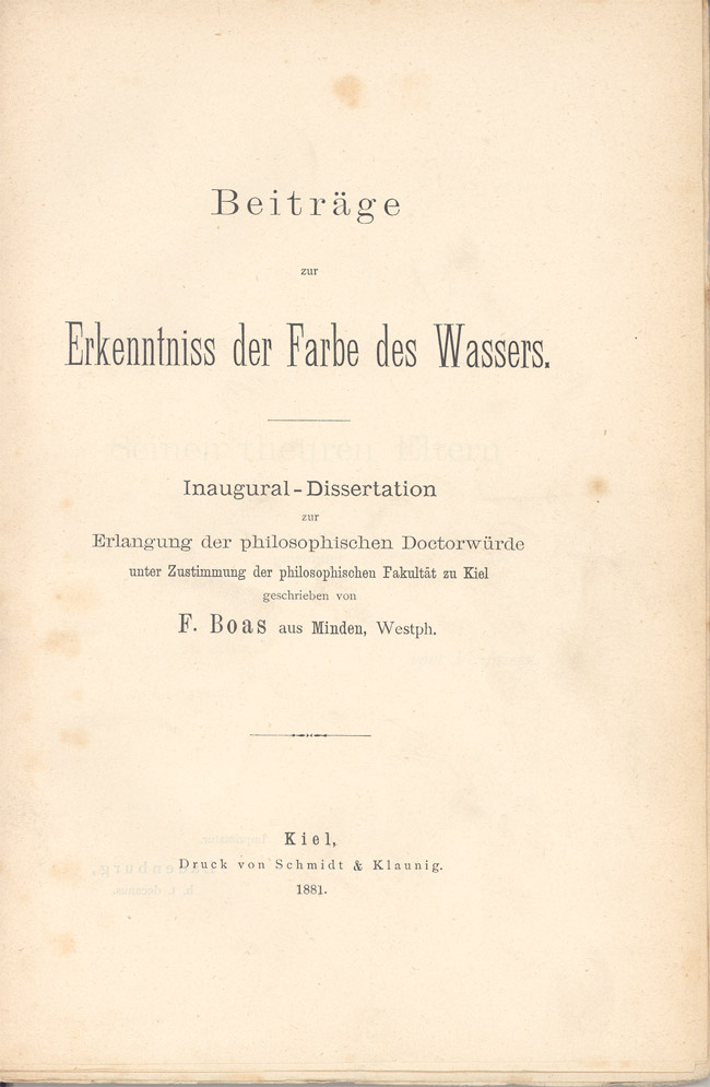 하이델베르크 대학교에서 1학기 동안 공부한 후, 본 대학교에서 4학기 동안 물리학, 지리학, 수학을 공부했다.[35][36][37] 1879년, 헤르만 폰 헬름홀츠 밑에서 물리학을 공부하기 위해 베를린 대학교로 편입하기를 희망했지만, 가족적인 이유로 킬 대학교로 편입하게 되었다.[38] 킬에서 보아스는 카를 프리드리히 가우스의 오차의 정규 분포 법칙에 대한 수학적 주제로 박사 논문을 쓰려 했으나, 지도 교수인 물리학자 구스타프 카르스텐이 정한 물의 광학적 성질에 대한 주제로 변경해야 했다.[39] 보아스는 "물의 색깔 인식에 대한 기여(Contributions to the Perception of the Color of Water)"라는 제목의 논문[40]으로 1881년 물리학 박사 학위를 받았다. 이 논문은 물에서 빛의 흡수, 반사, 편광을 조사한 것이었다.[41][42][43][44][45]