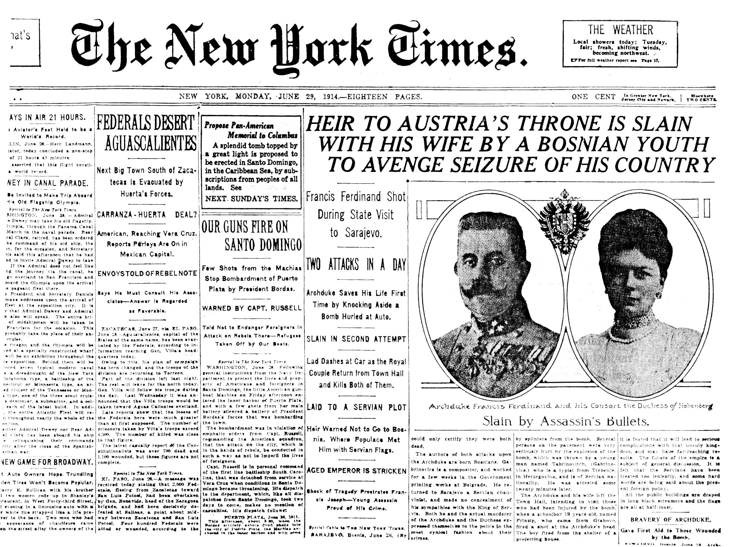 1914년 6월 28일 일요일 오전 10시 45분경, 프란츠 페르디난트 대공과 그의 부인은 오스트리아-헝가리 제국령 보스니아 헤르체고비나의 수도인 사라예보에서 암살되었다. 암살범은 19세의 가브릴로 프린치프로, 청년 보스니아의 일원이자 흑수단에 의해 조직된 암살단의 일원이었다.[5]