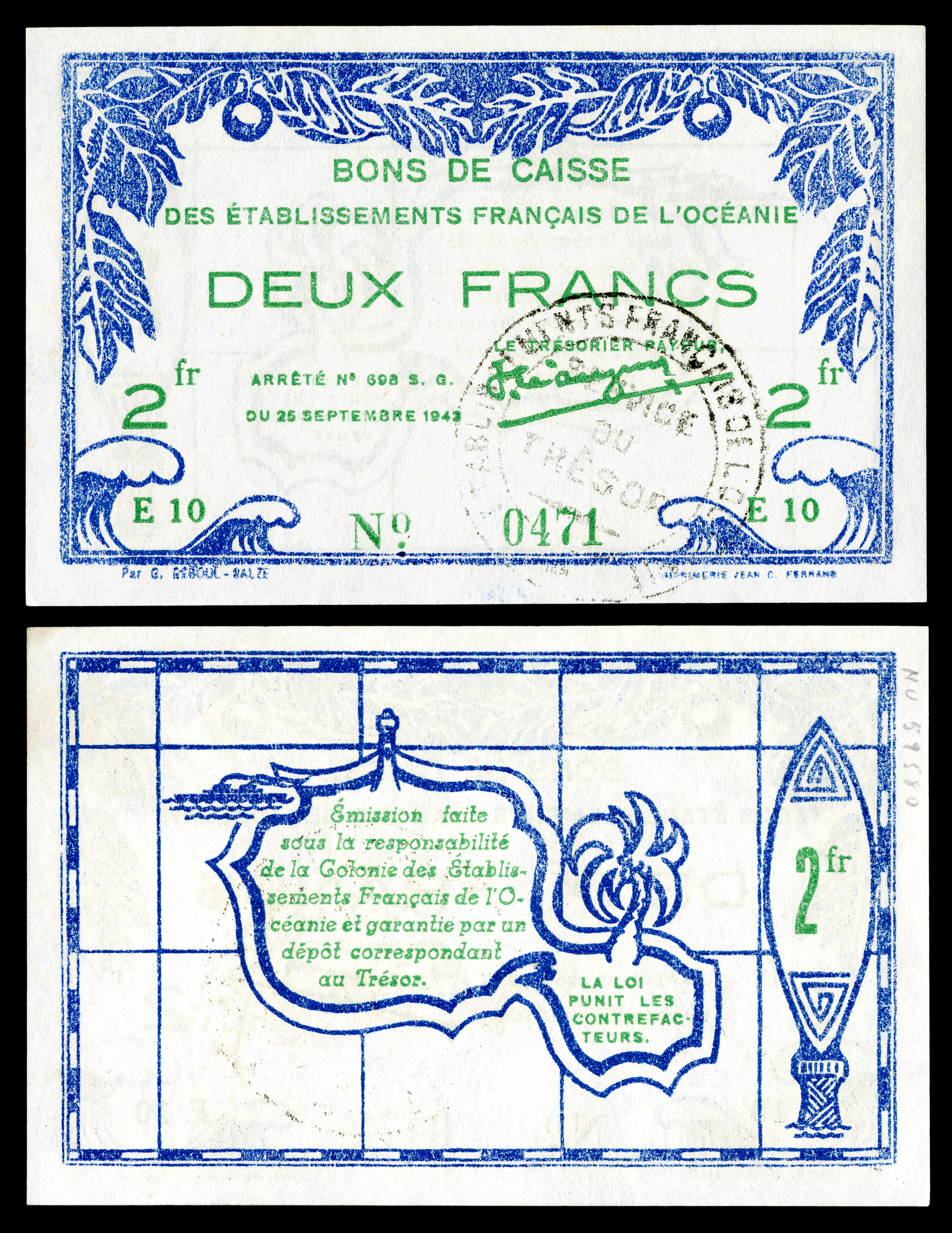 파페에테에서 인쇄된 2프랑짜리 제2차 세계 대전 비상 발행 지폐(1943년). 뒷면에 타히티의 윤곽이 그려져 있다.