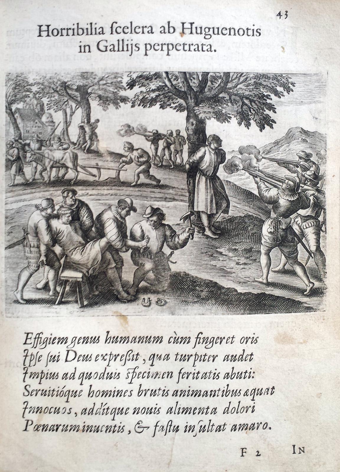 프랑스 내 위그노의 범죄를 묘사한 삽화: 왼쪽에는 가톨릭 신발에 말굽을 박는 위그노 4명, 나무에 묶인 가톨릭 신자를 처형하는 위그노 3명, 황소로 땅을 가는 사람들, 그 뒤에는 나무에 묶인 두 명의 가톨릭 신자 처형 장면이 묘사되어 있다. 뒷면에는 라틴어 활판 인쇄가 있다. ''Theatrum Crudelitatum Haereticorum Nostri Temporis'' (리처드 버스테건, 1588) 판 삽화