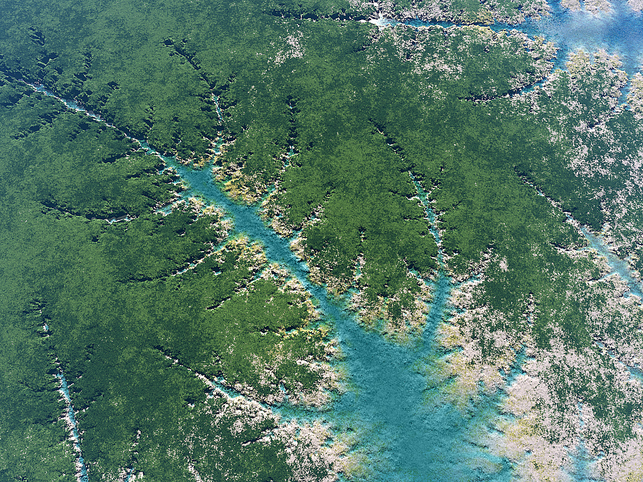 - 강줄기: 강의 부분과 전체는 닮았다. 나일강과 한강의 모습이 전체적으로 비슷하고, 어느 지역에서건 강의 모습은 비슷한 형태를 지닌다. 지류와 전체적인 강줄기의 모습은 닮았다. 수많은 비가 내리면서 산에 많은 분기점이 생기고, 이 하나하나가 작은 강이 되어 큰 줄기로 만났다가 작은 줄기로 뻗어나가는 행위를 반복한다.