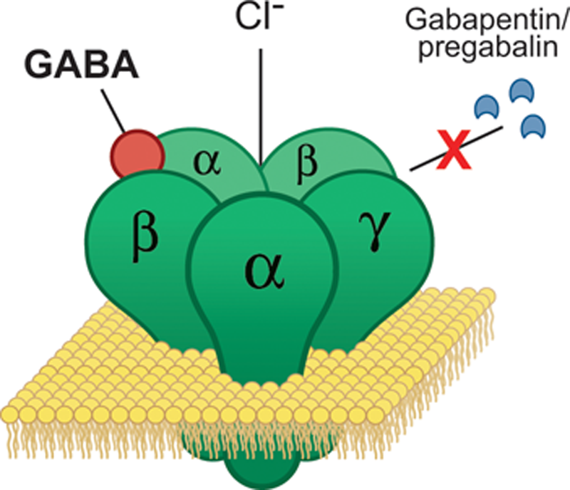 프레가발린은 가바펜티노이드 약물로, γ-아미노부티르산(GABA)의 화학 유도체이다. GABA는 억제성 신경전달물질이지만, 프레가발린은 GABA를 모방하거나 GABA 수용체에 영향을 미치지 않는다. 대신 α2δ-1 단백질의 특정 부위에 결합하여 흥분성 신경전달물질의 방출을 감소시킨다.[89]