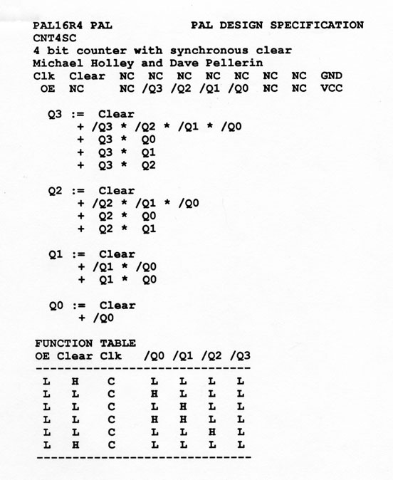 PALASM영어은 1980년대 초 존 버크너가 개발한 초기 PAL 프로그래밍 언어이다. MMI는 PALASM 컴파일러를 FORTRAN IV로 작성하여 IBM 370/168에서 실행했다. MMI는 소스 코드를 사용자에게 무료로 제공했으며, 1983년에는 DEC PDP-11, 데이터 제너럴 NOVA, 휴렛 팩커드 HP 2100, MDS800 등에서도 실행 가능한 버전을 제공했다.[3]PALASM은 텍스트 파일에 출력 핀에 대한 불 방정식을 표현하는 방식으로 사용되었으며, 벤더가 제공하는 프로그램을 통해 프로그래밍 시스템에서 사용 가능한 '퓨즈 맵' 파일로 변환되었다. 이후 회로도에서 변환하는 방식이 일반화되었고, 더 나아가 Verilog와 같은 HDL을 통해 '퓨즈 맵'을 합성하는 것도 가능해졌다.