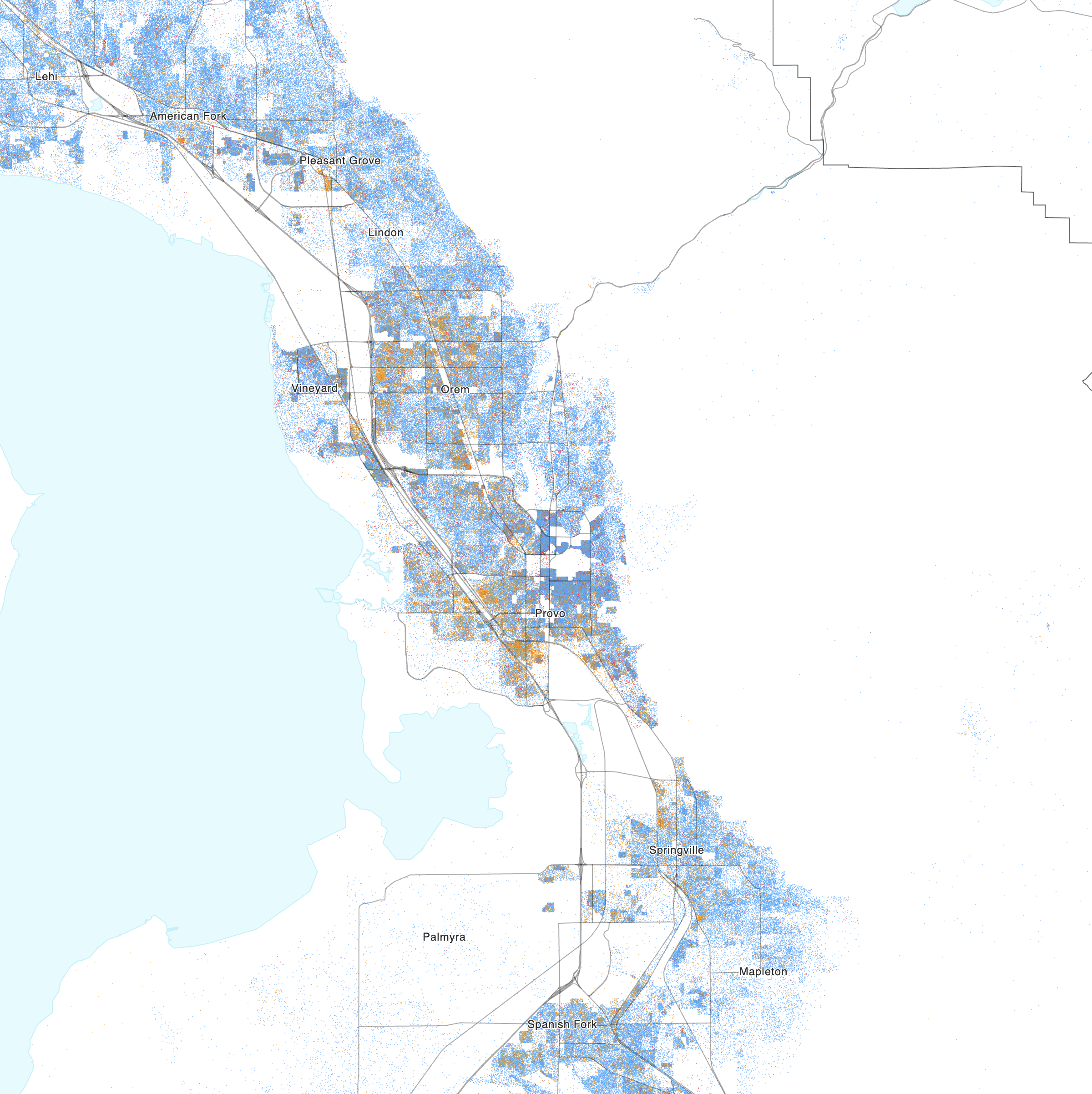 2010년 유타 카운티의 분석에 따르면, 대부분의 사람들(90.6%)은 기독교인이었으며, 말일성도들이 인구의 88.7%를 차지했다. 가톨릭교도는 1.3%, 개신교도는 0.6%를 차지했다. 기타 종교는 인구의 0.3%를 차지했다. 인구의 9.1%는 어떠한 종교도 믿지 않았다.[30] 프로보 주민들은 몰몬교(LDS) 신자가 많다.종교 | 백분율(%) |