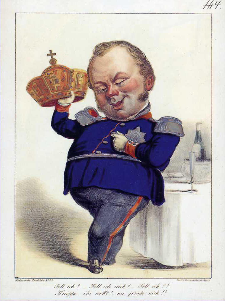 프로이센 국왕 프리드리히 빌헬름 4세가 프랑크푸르트 국민의회 의원들이 건넨 제국 왕관을 손에 들고, 재킷 단추를 세며 이를 수락할지 여부를 결정하는 모습: "받아야 할까? 말아야 할까? 해야 할까?! 단추들아, 넌 내가 하길 바라는구나! 바로 그래서 안 하겠다!!"