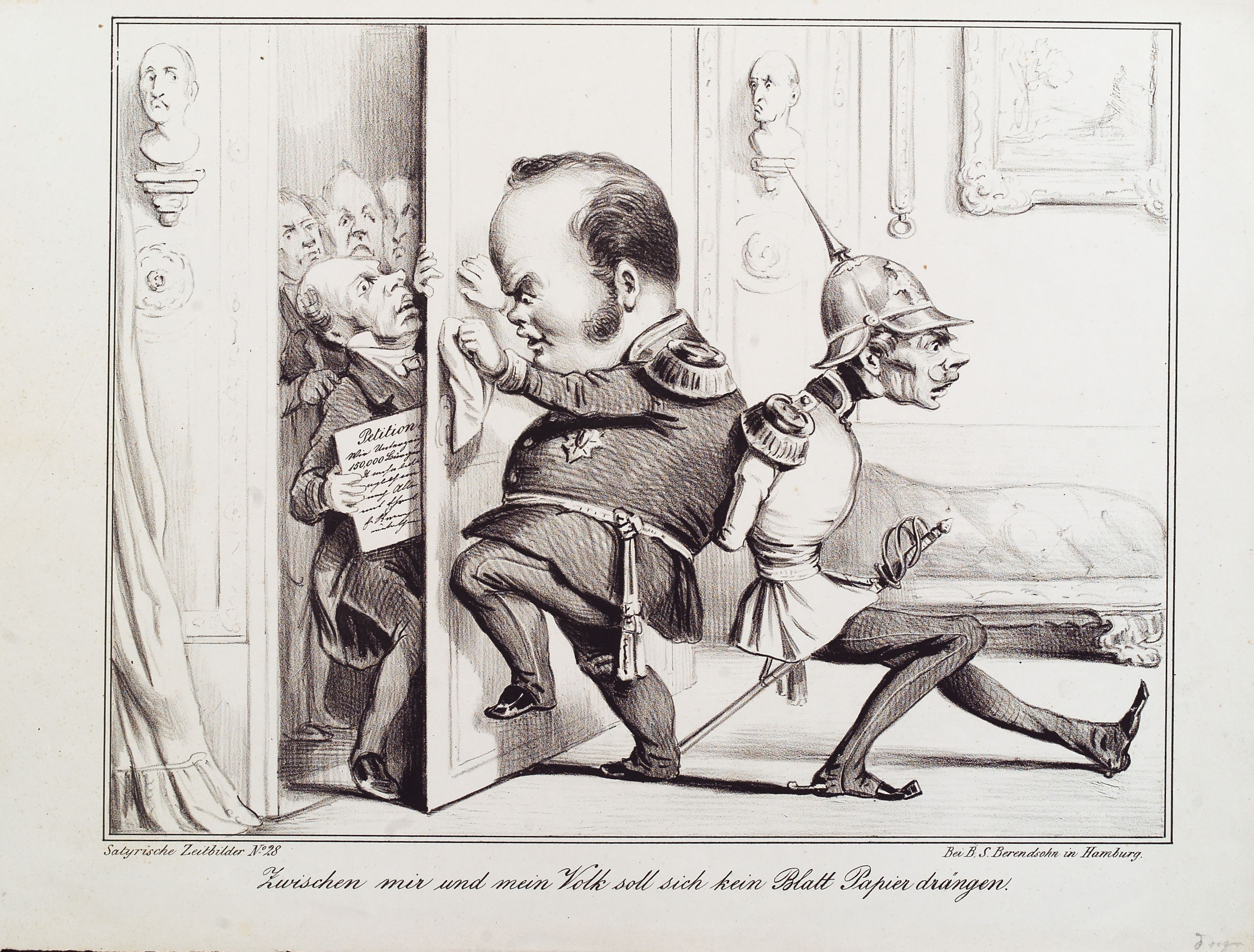 프리드리히 빌헬름 4세가 폰 랑겔 장군의 도움을 받아, 헌법에 대한 국민 의회의 요구에 저항하는 모습의 풍자화: "나와 내 백성 사이에는 종이 한 장도 끼어들 수 없다." 1848년 Satyrische Zeitbilder #28에서