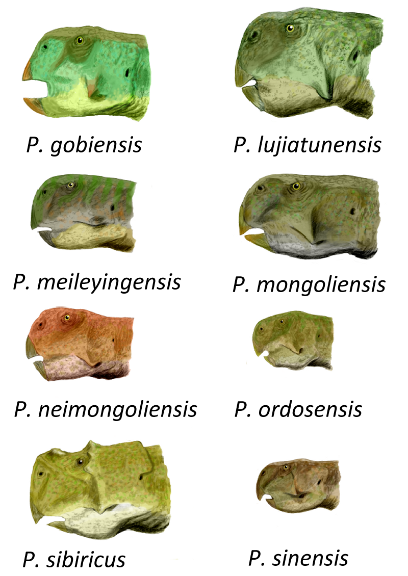 ''P. 신장엔시스''는 앞쪽 끝이 납작한 두드러진 관골 '뿔'과 이빨의 일부 특징으로 구별된다. 골반을 구성하는 세 개의 뼈 중 하나인 장골에도 비구 뒤쪽에 특징적으로 긴 뼈 돌기가 있다.[12] 성체의 넙다리뼈는 약 16cm의 길이가 보고되었다.[35] ''P. 메일리잉엔시스''는 어떤 종보다 짧은 주둥이와 목깃을 가지고 있어 두개골이 거의 원형에 가깝다. 안와(눈구멍)는 대략 삼각형이고, 이빨뼈의 아래쪽 가장자리에는 두드러진 플랜지가 있는데, 이는 ''P. 루지아투넨시스'' 표본에서도 볼 수 있으며, ''P. 몽골리엔시스'', ''P. 사타야라키'', 그리고 ''P. 시비리쿠스''에서도 덜 나타난다.[38][12] 완전한 기준 두개골은 아마도 성체이며, 길이가 13.7cm이다.[36] ''P. 사타야라키''의 이빨뼈는 ''P. 몽골리엔시스'', ''P. 시비리쿠스'', ''P. 루지아투넨시스'' 및 ''P. 메일리잉엔시스''에서 발견되는 것과 유사한 플랜지를 가지고 있지만, 해당 종보다 덜 두드러진다. 재료는 대략 ''P. 시넨시스''와 같은 크기인 것으로 보인다.[19] ''P. 네이몽골리엔시스''의 전두골은 다른 종에 비해 뚜렷하게 좁아 전체적으로 좁은 두개골을 만든다. 골반의 좌골 또한 넙다리뼈보다 길며, 이는 이러한 뼈가 알려진 다른 종과 다릅니다.[12] 기준 표본은 두개골 길이가 13.2cm이고 넙다리뼈 길이는 13cm이지만 완전히 성장하지 않았다. 성체 ''P. 네이몽골리엔시스''는 아마도 ''P. 몽골리엔시스''보다 작았고, 비례적으로 더 긴 두개골과 꼬리를 가졌을 것이다.[34] ''P. 오르도센시스''는 매우 두드러진 '뿔'을 가진 관골의 수많은 특징으로 구별할 수 있다.[12] 또한 알려진 가장 작은 종이다. 한 성체 두개골은 길이가 9.5cm에 불과하다.[34]