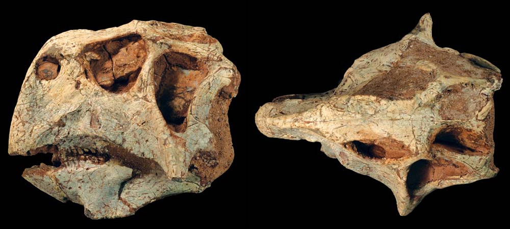 프시타코사우루스 두개골은 위턱 끝의 주둥이뼈, 옆으로 펼쳐진 광대뼈 등 더 발달된 각룡류의 특징을 일부 공유한다. 그러나 뼈로 된 목 부분의 프릴이나 얼굴 뿔은 후대 각룡류에서만 나타난다.[98] ''P. 시비리쿠스''에서 뼈로 된 뿔이 발견되지만, 이는 수렴 진화의 예로 여겨진다.[130]