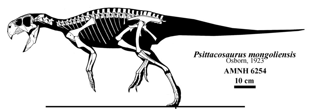 프시타코사우루스는 여러 종들이 크기, 두개골, 골격 등에서 차이를 보이지만, 전반적인 몸 형태는 비슷하다. 가장 잘 알려진 종인 ''P. 몽골리엔시스''는 몸길이가 2m까지 자랐다.[91] 성체의 몸무게는 최대 20kg에 달했을 것으로 추정된다.[92]