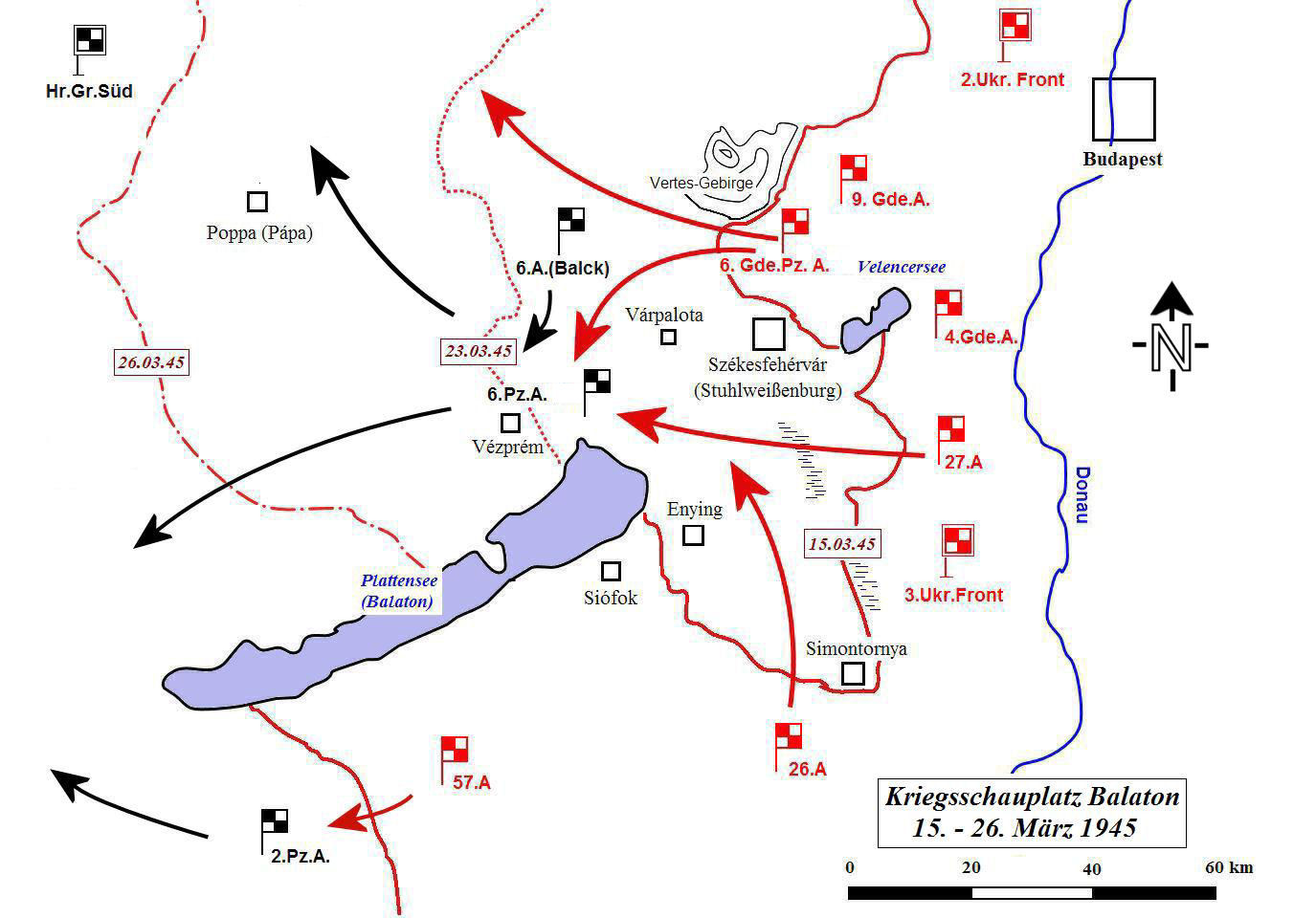 봄의 각성 작전에서의 독일군 공세. 무장친위대 제6SS[친위대] 기갑군단이 벌러톤 호와 벨렌체 호 사이에서, 제2기갑군이 벌러톤 호 남부에서, E[육군] 집단의 2개 군단이 파라도 강에서 헝가리와 유고슬라비아 국경에서 각각 진격을 시작했다.