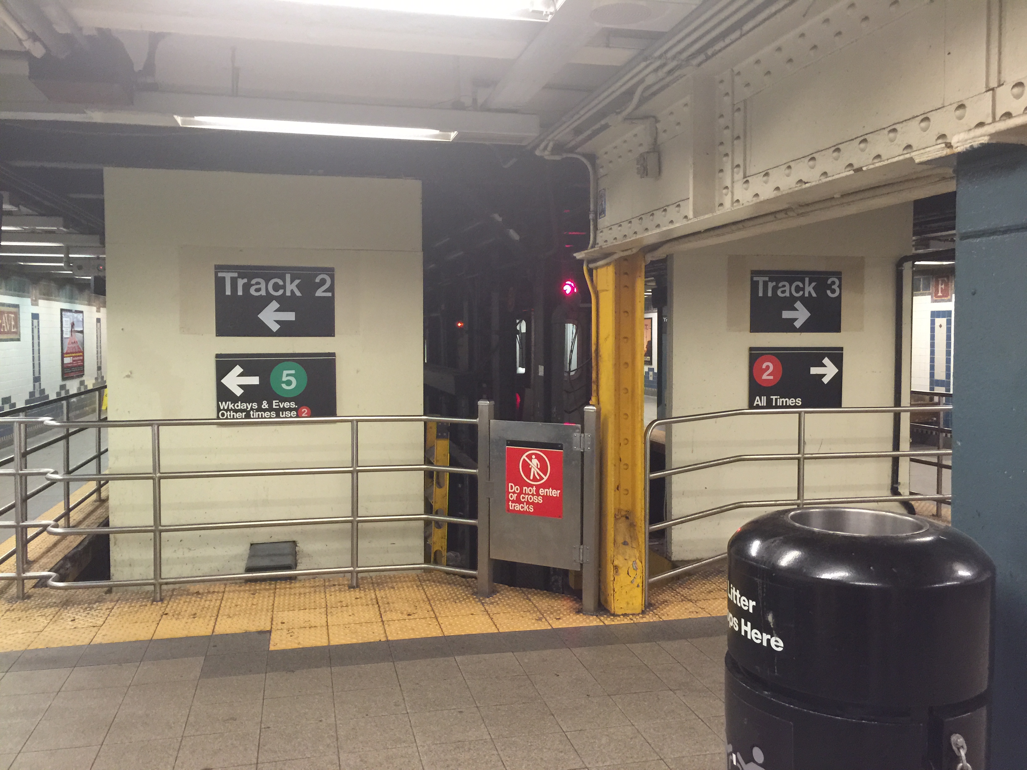 종착역이므로 역의 남쪽에서는 양쪽 승강장을 왕래할 수 있다.[53] 평일에는 열차가 3번 선을, 열차가 2번 선을 사용한다. 단, 열차는 주말 종착역이 IRT 렉싱턴 애비뉴선볼링 그린역, 심야 시간대에는 IRT 화이트 플레인스 로드선동180번가역이기 때문에 주말과 심야 시간대에는 열차가 3번 선과 2번 선 모두 사용한다.[60]