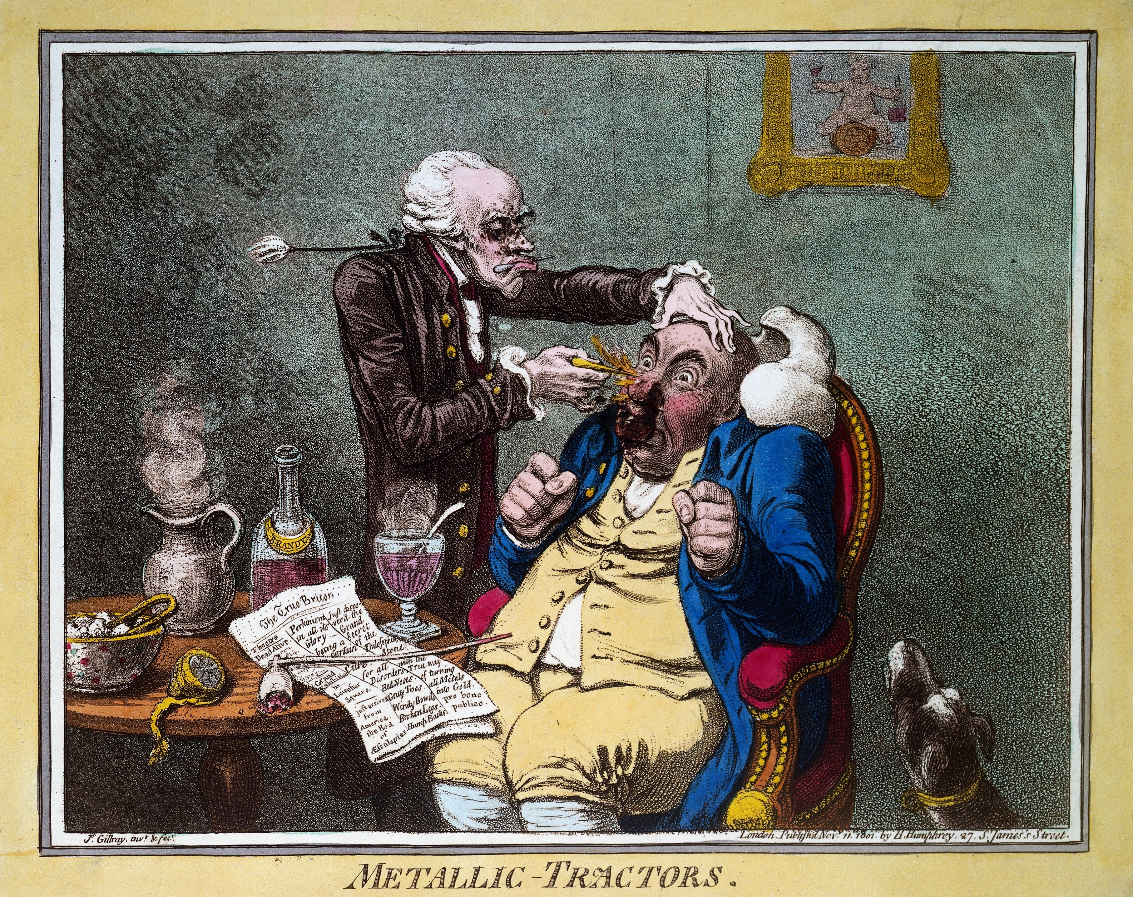 제임스 길레이가 그린 그림, 1801년, "금속 트랙터"로 환자를 치료하는 모습. 존 헤이거스는 이 요법을 사용하여 플라시보 효과의 힘을 설명했다.