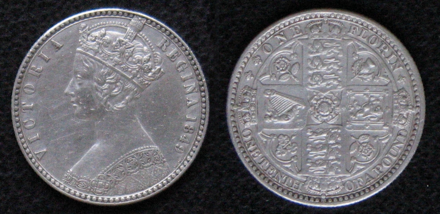 최초의 플로린은 1849년에 주조되었다. 이 동전은 고딕 양식이었으며, 매우 젊은 빅토리아 여왕의 초상이 새겨져 있었다.[2] 뒷면에는 잉글랜드(영국 국장의 일반적인 배열에 따라 두 번), 스코틀랜드, 아일랜드의 왕관 방패가 십자형으로 배치되었고, 각 각도에는 해당 국가의 꽃 문장이 새겨져 있었다(잉글랜드의 문장은 다시 두 번 표시).[2] 이 동전은 "무신론 플로린"이라고 불렸는데, 그 이유는 동전에 일반적인 약자인 ''Dei Gratia''(신의 은총으로)가 생략되었기 때문이다.[2]