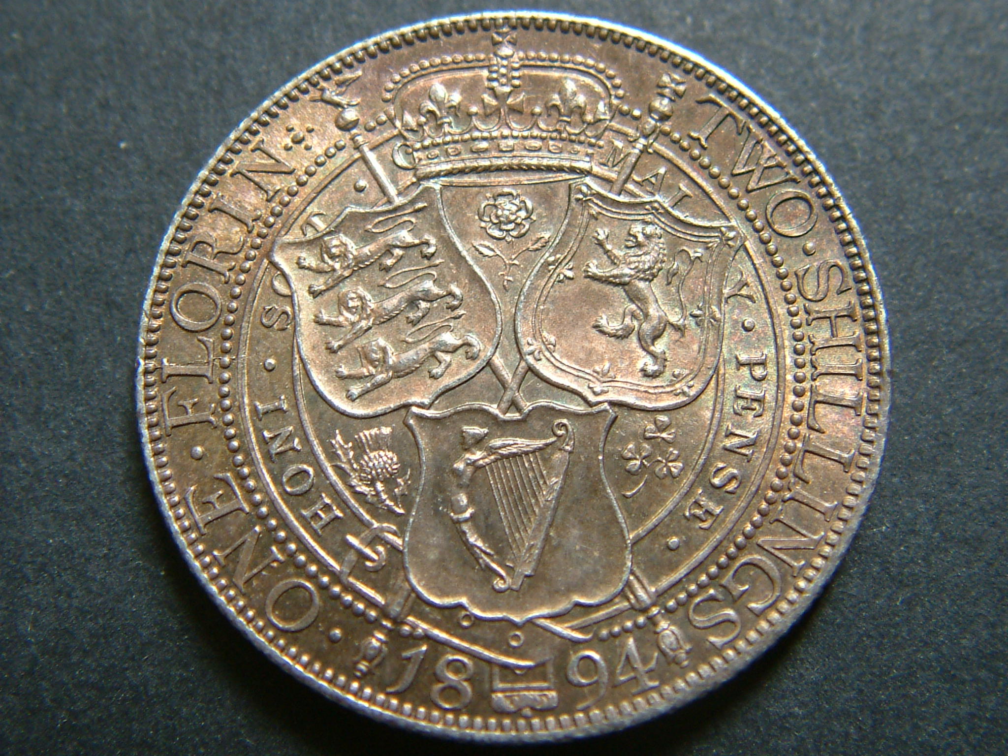 올드 헤드 | 1893년 ~ 1901년 | 베일을 쓴 노년의 여왕 초상, 뒷면에 3개의 방패와 "ONE FLORIN TWO SHILLINGS" 문구 |