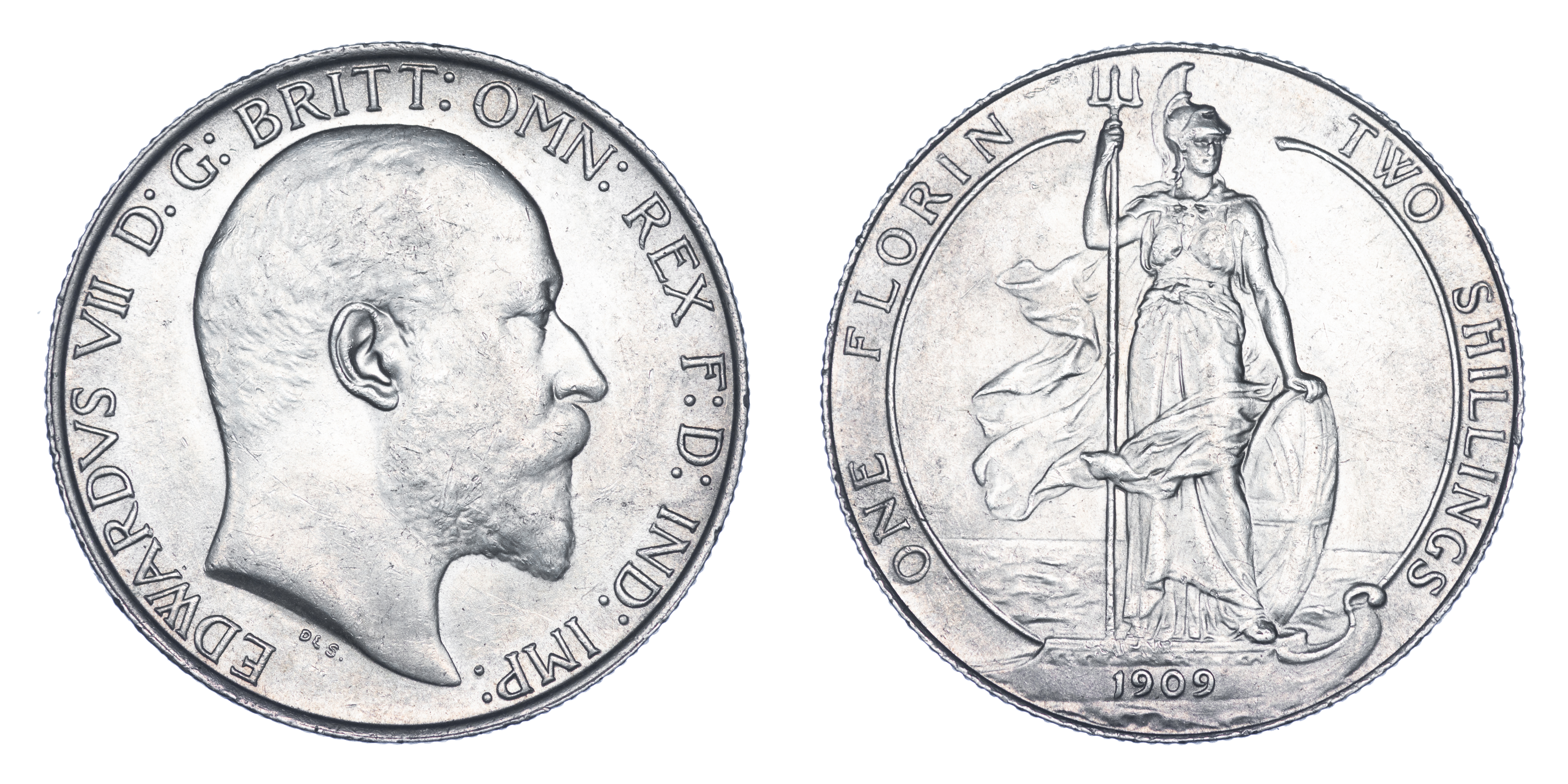 에드워드 7세의 플로린은 1902년부터 1910년까지 매년 주조되었다. 양면 모두 조지 윌리엄 드 소스가 제작했다. 뒷면은 바람에 흩날리는 브리타니아의 모습이 왼손으로 방패를, 오른손으로 삼지창을 들고 서 있는 모습이었다.[2]