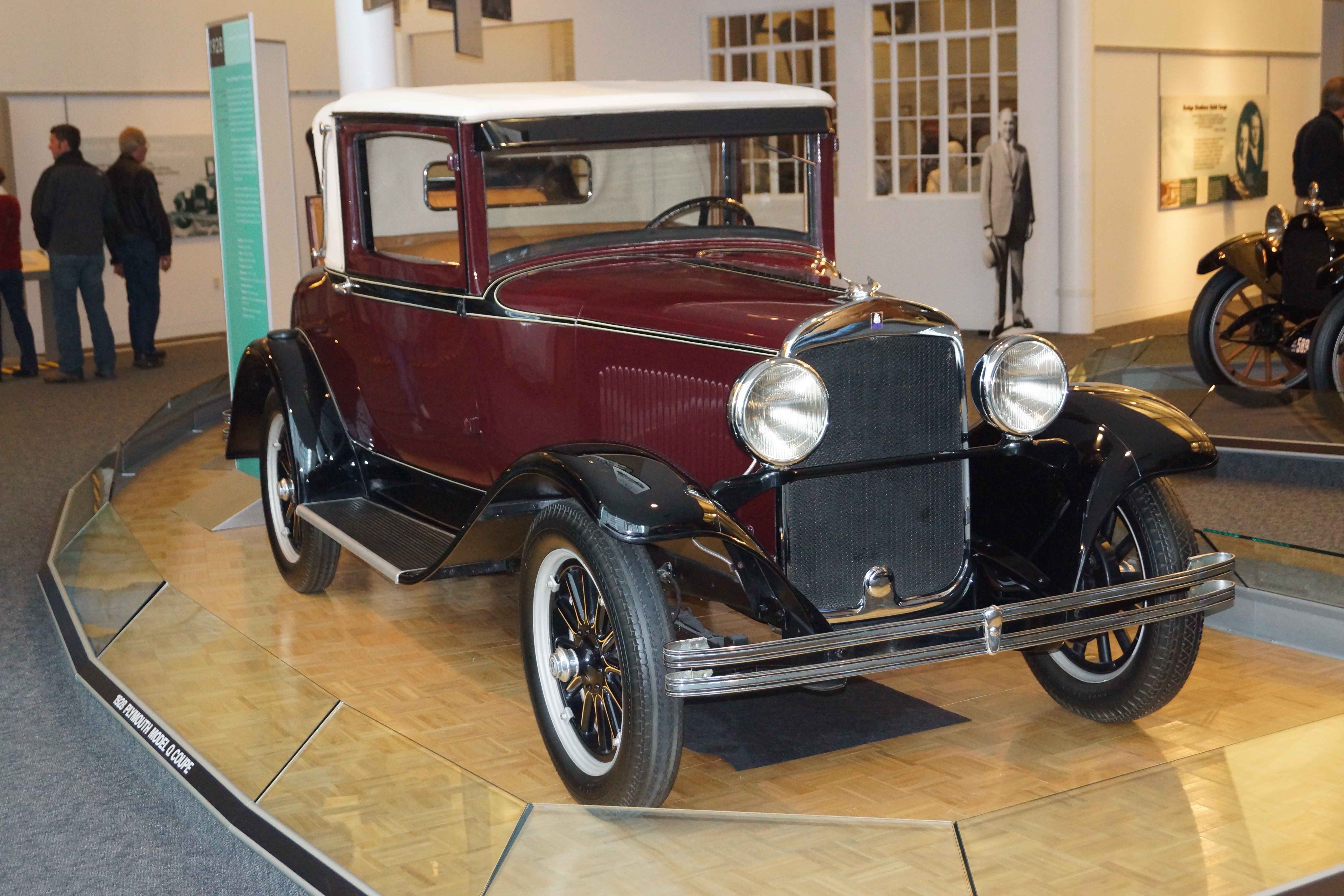 플리머스 자동차는 1928년 7월 7일 메디슨 스퀘어 가든에서 처음 공개되었다.[1] 쉐보레와 포드가 지배하던 저가형 시장에 크라이슬러 사가 처음으로 진출한 것이었다.[2] 플리머스는 처음에는 경쟁사보다 가격이 높았지만, 포드와 쉐보레가 제공하지 않던 내부 확장 유압 브레이크와 같은 표준 기능을 제공했다.[3] 크라이슬러 딜러십을 통해서만 판매되었으며,[3] 4도어 5인승 투어링 세단을 695USD에 판매하면서 고급 크라이슬러 브랜드 차량에 대한 저렴한 대안을 제시했다.[7] 로고는 플리머스 록에 상륙한 배 ''메이플라워''의 선수 부분을 특징으로 했다. 하지만 플리머스 브랜드 이름의 영감은 플리머스에 있는 플리머스 코드지 컴퍼니에서 생산한 플리머스 바인더 트위스트에서 비롯되었다. 이 이름은 조 프레이저가 농부들 사이에서 트위스트의 인기가 높았기 때문에 선택되었다.[4]