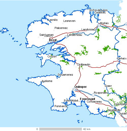 해안선은 1250km에 달하며, 이는 프랑스 전체 해안선의 1/4을 차지한다. 해안선은 굴곡이 심하고, 많은 곶, 만, 반도, 피오르와 유사한 리아스식 해안이 있으며, 이는 그 경관의 두드러진 특징이다. 주 북서쪽 끝에서 뻗어 있는 코르상 곶은 프랑스 최서단 지점이다. 코르상 곶에서 남쪽으로 약 40km 떨어진 곳에는 라 곶이 있는데, 이곳은 코르상 곶보다 약간 덜 서쪽에 있지만 거칠고 외딴 곳이다.