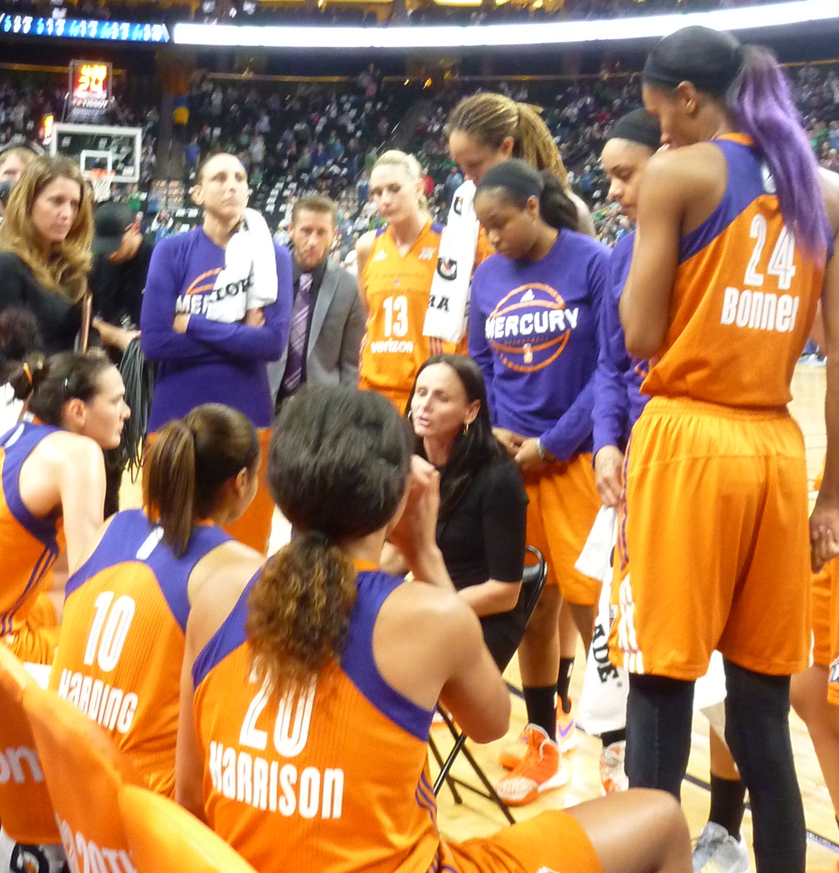 2016 WNBA 준결승전에서 타임아웃 중인 코치 줄리 헤어그로브, 토드 트록셀(왼쪽부터)과 감독 샌디 브론델로(앉아 있음).