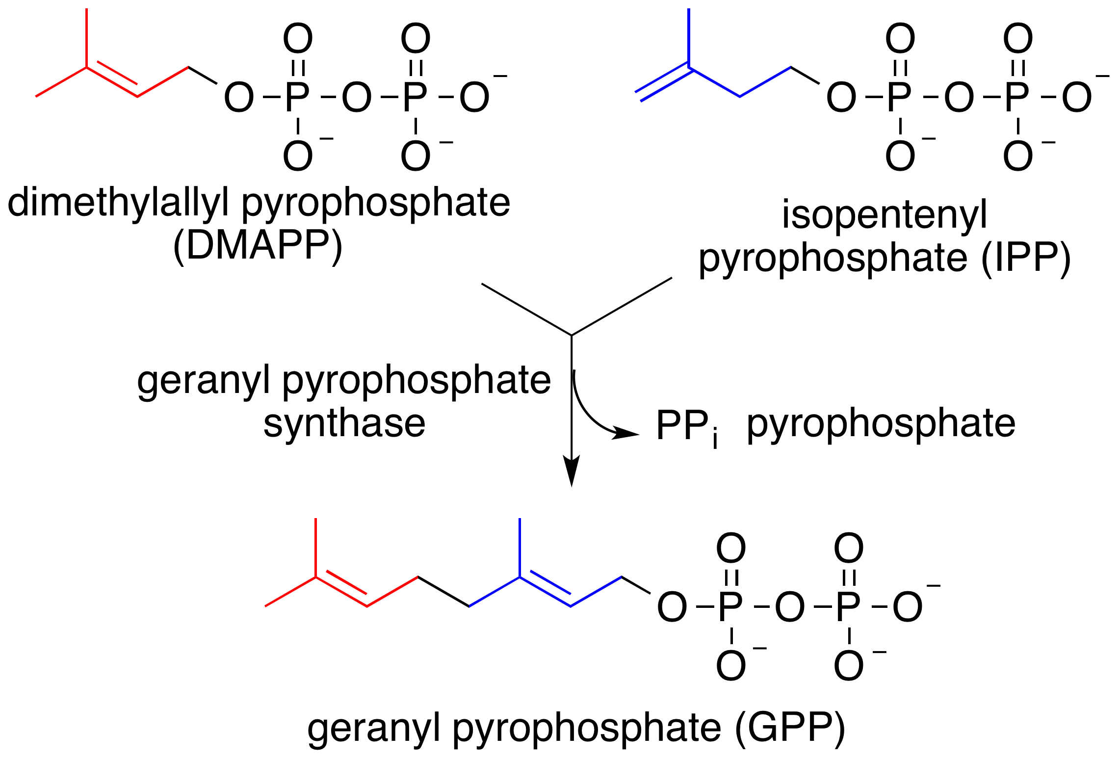 아이소펜테닐 피로인산은 수만 가지의 테르펜 및 테르페노이드의 전구체인 제라닐 피로인산으로 전환된다.[24]