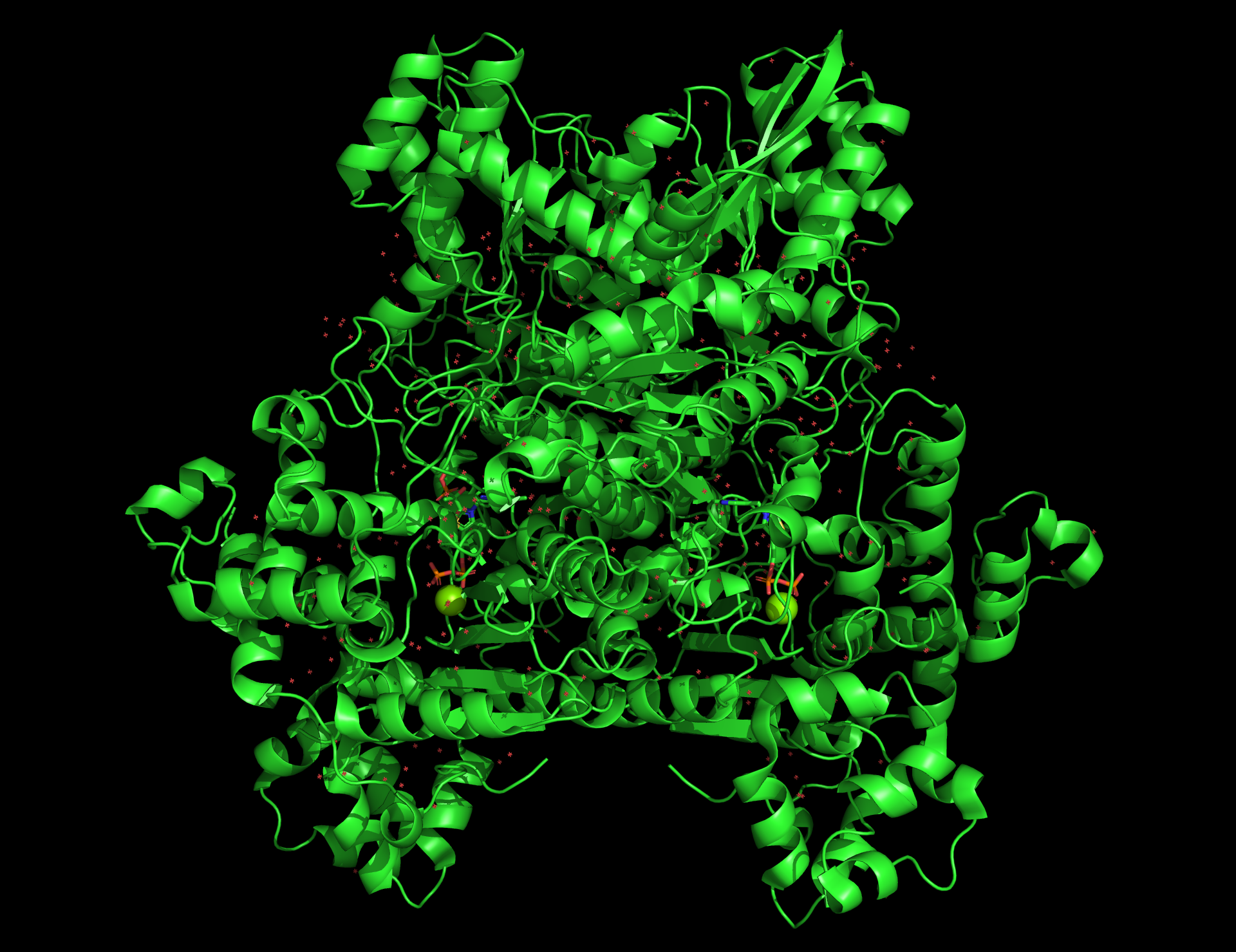 피루브산 탈수소효소(E1)는 피루브산 탈수소효소 복합체의 소단위체 중 하나로, 동종이량체(예: 대장균에서 두 개의 "α" 사슬) 또는 이종사량체(두 개의 "α" 사슬 및 두 개의 "β" 사슬) 구조를 갖는다. 마그네슘 이온은 α 사슬에 있는 세 개의 극성 아미노산 잔기(Asp, Asn, Tyr)와 티아민 피로인산(TPP)에 4배위 복합체를 형성하며, TPP는 피루브산의 탈카복실화에 직접 관여하는 보조 인자이다.[27][28]