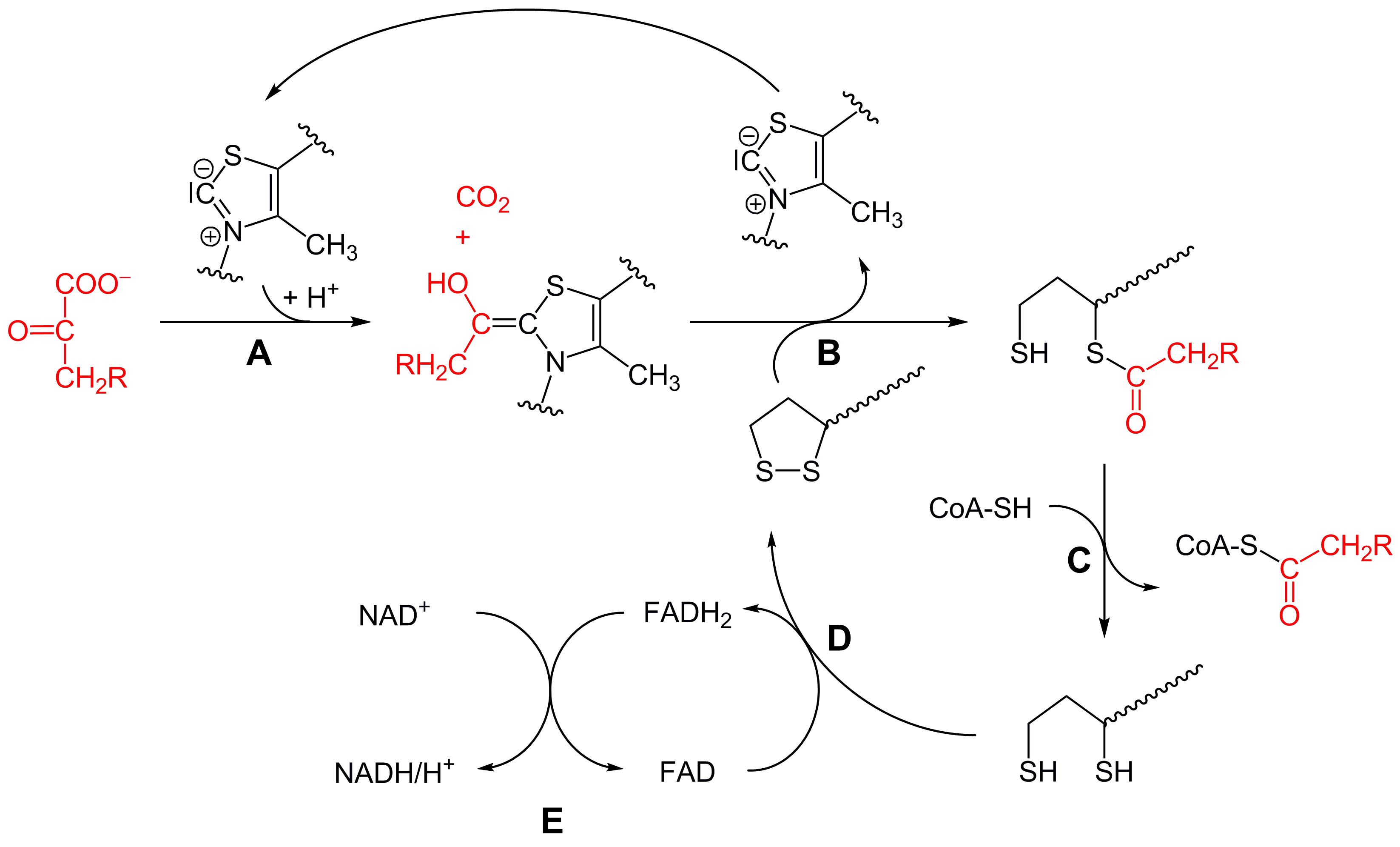 피루브산 탈수소효소 소단위체(E1)에 의한 첫 번째 단계는 피루브산과 티아민 피로인산(TPP)의 결합이다.[25] TPP의 티아졸륨 고리는 양쪽성 이온 형태이며, 음이온성 C2 탄소가 피루브산의 C2 카보닐기(케톤)를 친핵성 공격한다. 생성된 헤미티오아세탈은 탈카복실화를 거쳐 아실 음이온 등가물을 생성한다. 이 음이온은 리신 잔기에 부착된 산화된 리포산의 S1을 공격한다. 개환 SN2 유사 메커니즘에서 S2는 황화물 또는 설프하이드릴 부분으로 대체된다. 이후 사면체 헤미티오아세탈이 붕괴되면 티아졸이 방출되고 TPP 보조 인자가 방출되며 리포산의 S1에 티오아세트산이 생성된다. E1 촉매 과정은 전체 피루브산 탈수소효소 복합체의 속도 제한 단계이다.