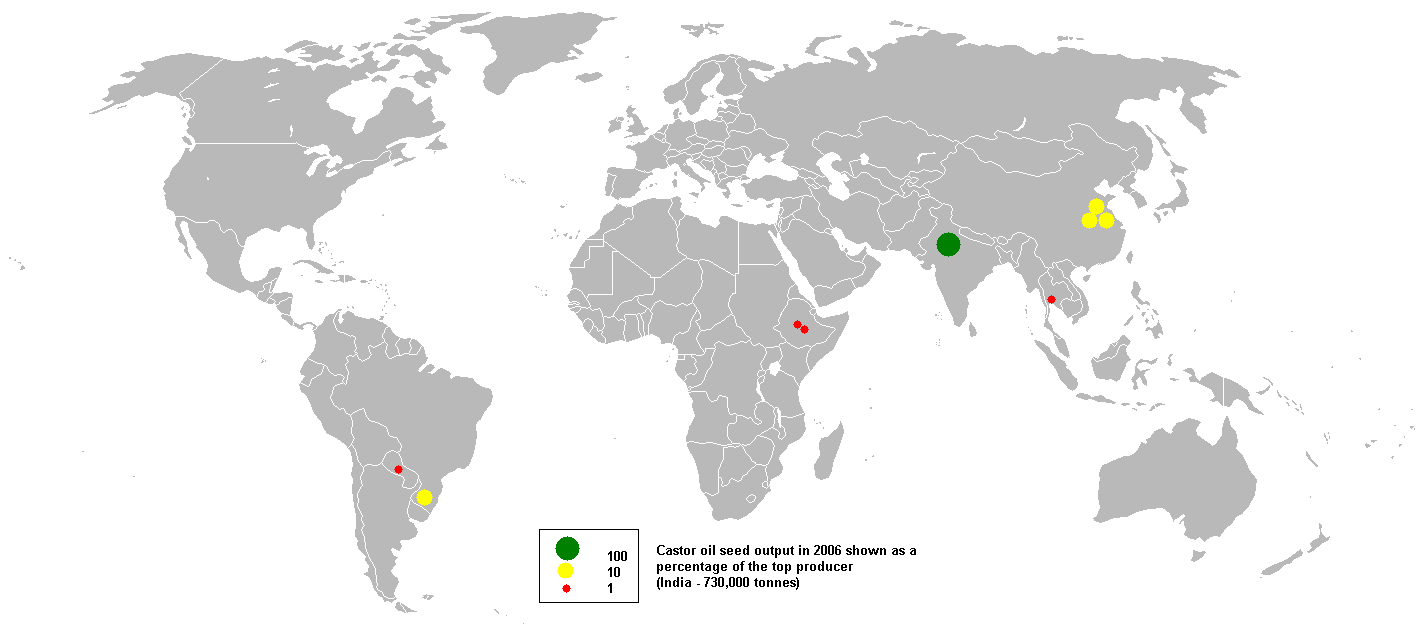피마자는 전 세계적으로 연간 약 100만 톤이 생산되며, 주요 생산지는 인도, 중국, 브라질이다.[45] 이들 국가에서는 활발한 생산 계획이 실시되고 있다.