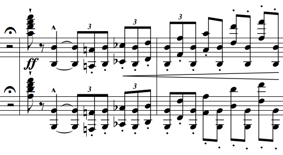 이후 하행하는 반음계 옥타브가 다시 나타나지만, 이번에는 레벨로 연주되며, 오케스트라는 상행하는 반음계 섹션을 연주하여 첫 번째 주제의 조화로운 재현으로 이어진다. 악장은 첫 번째 악장의 시작 부분과 매우 유사한 음악으로 끝나며, 피아노의 맹렬한 패시지가 F 감7화음(오른손: F–A–D–F)으로 끝맺는다.