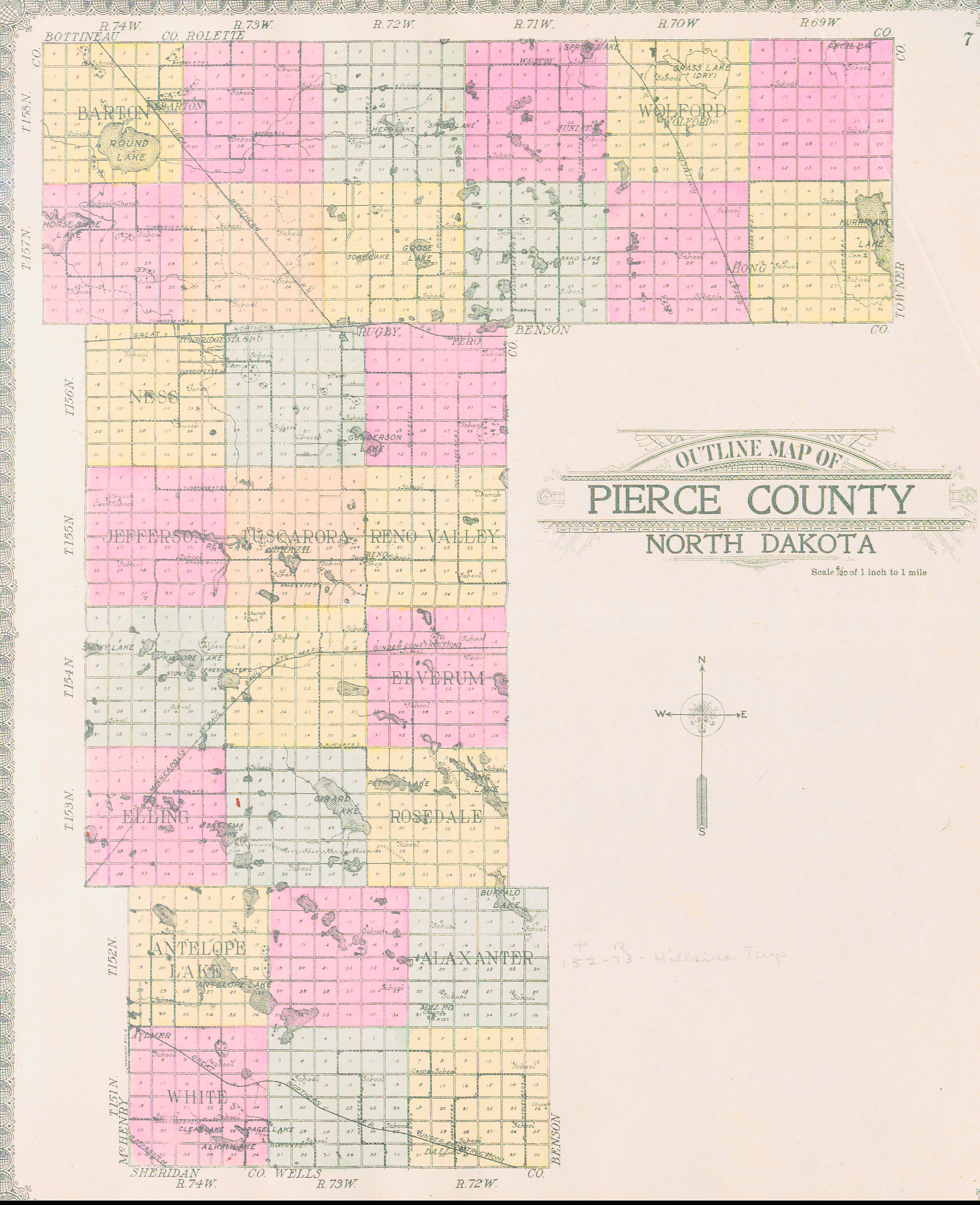 다코타 준주 입법부는 1887년 3월 11일, 보티노군, 롤레트군, 맥헨리군 및 현재는 사라진 데스멧군에서 분할된 지역을 포함하여 피어스군을 만들었다. 이 군은 다코타의 정치인이자 1884년부터 1886년까지 다코타 준주 지사, 1889년부터 1891년까지 노스다코타주 연방 상원의원을 역임한 길버트 A. 피어스의 이름을 따서 명명되었다.[3][4]