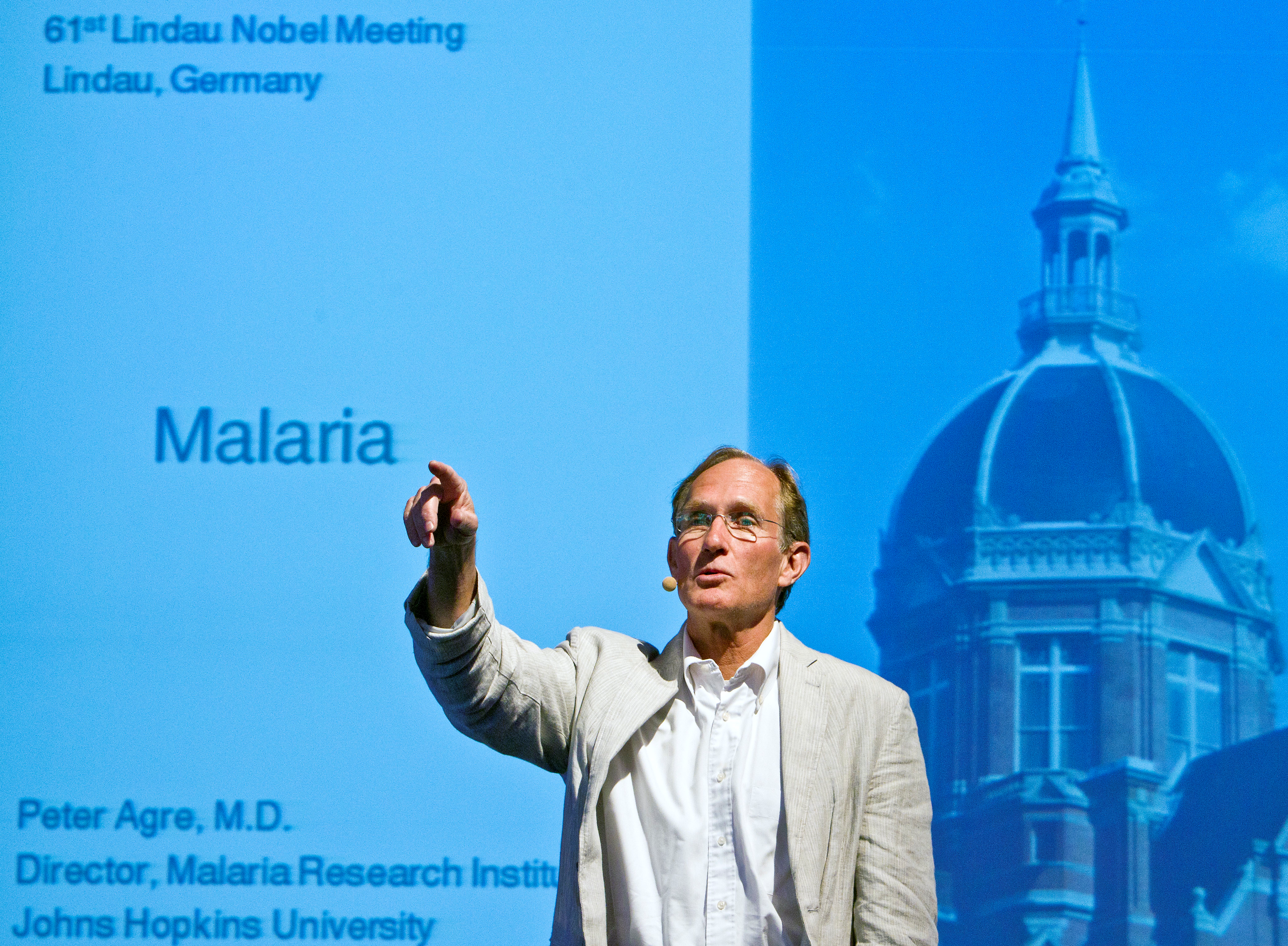 독일 린다우에서 열린 제61회 린다우 노벨상 수상자 회의에서 말라리아에 대해 강의하는 피터 아그레