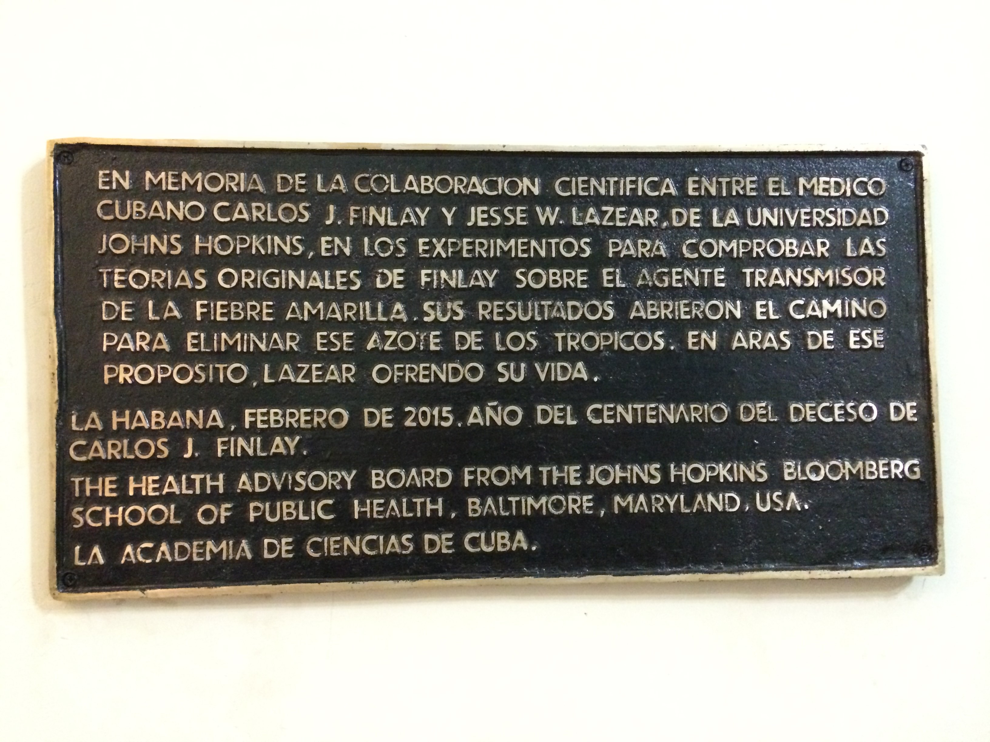 2015년 2월 존스 홉킨스 블룸버그 공중 보건 대학원 자문 위원회의 아바나 방문 중 쿠바 과학 아카데미에서 쿠바 과학자 카를로스 핀레이와 존스 홉킨스 과학자 제시 라지어의 협력을 기념하여 세워진 명판