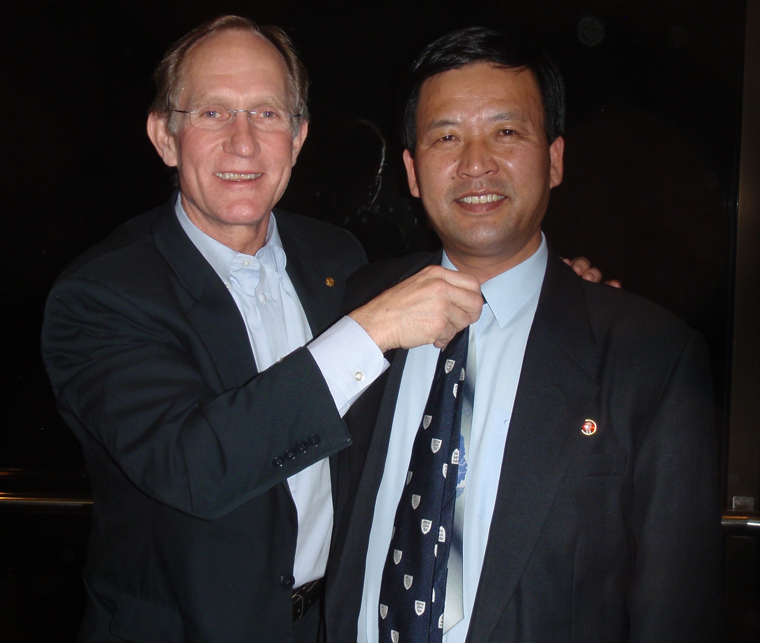 2009년 북한 과학원 부원장에게 존스홉킨스 넥타이를 전달하는 피터 아그리. 2003년 스톡홀름 노벨 강연에서 아그리가 착용한 넥타이는 북한 최초의 노벨상 수상자에게 전달될 예정이다.