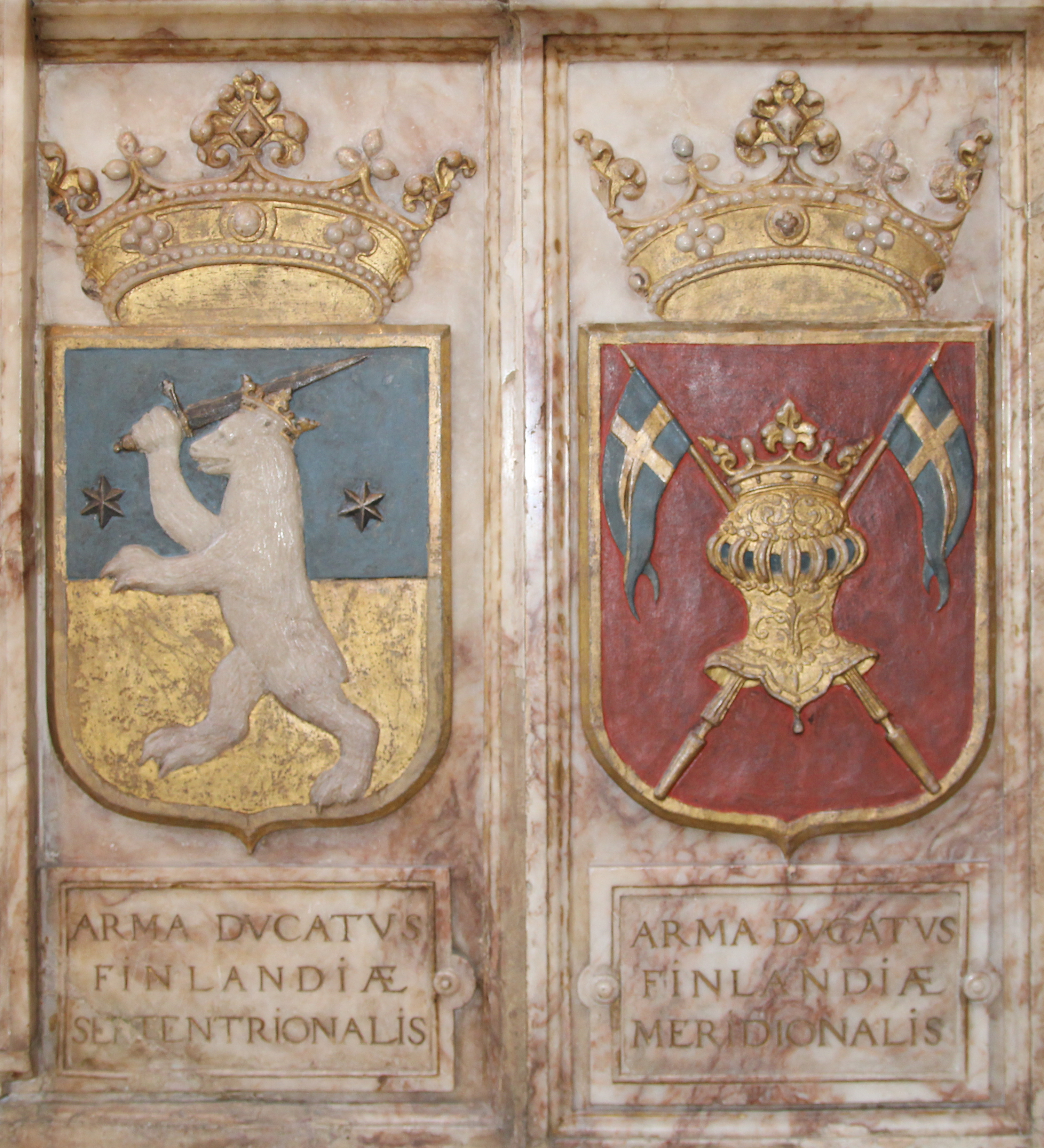 구스타브 바사의 묘, 사타쿤타와 핀란드 본토의 문장이 보인다.