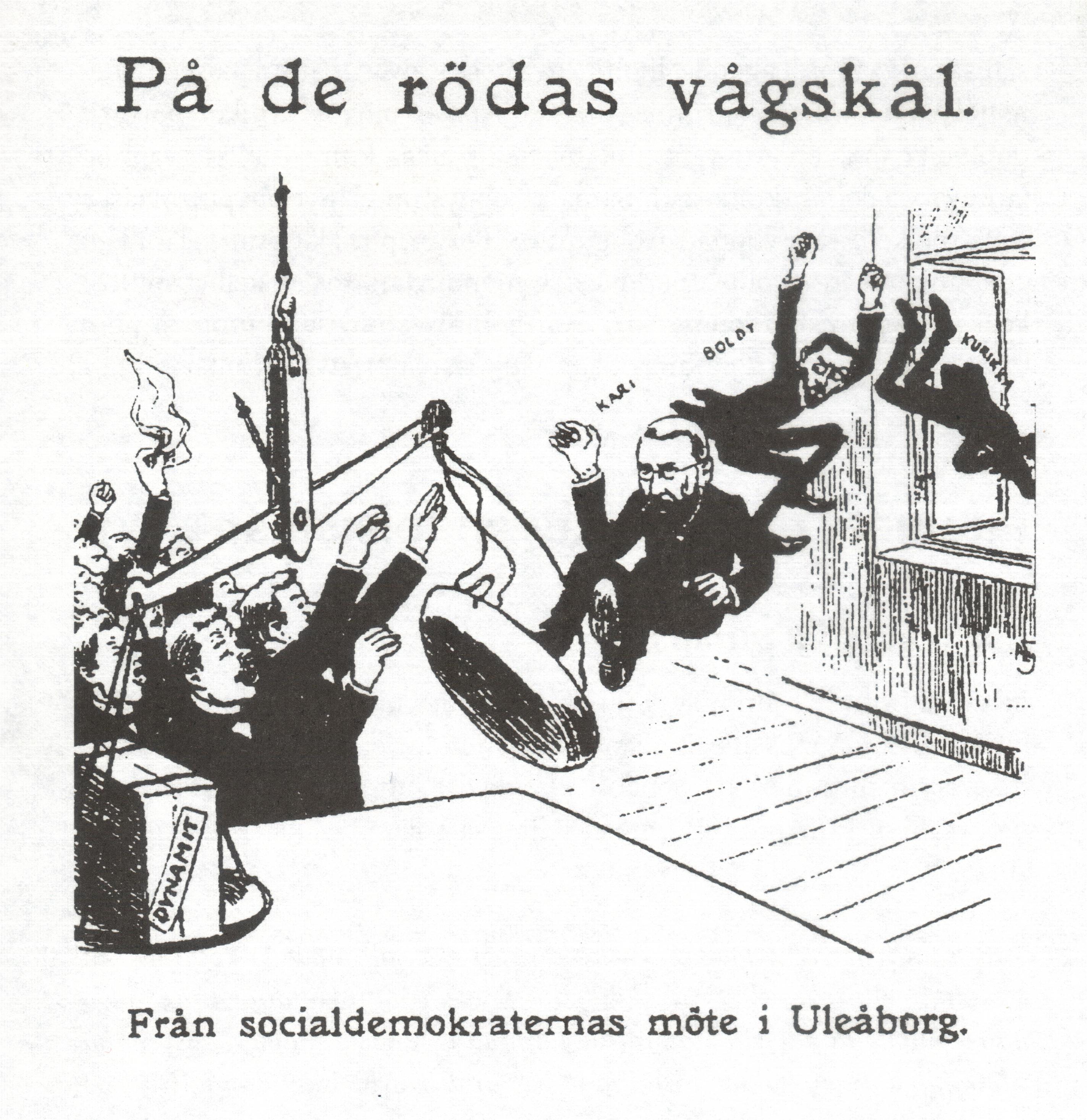 오울루 대회에서 유호 퀴외스티 카리, 장 볼트, 마티 쿠리카 등이 제명당한 것을 풍자한 우파 언론 『퓌렌』의 만평(알렉스 페데를레위 그림). 이들 고참들을 쫓아낸 대신 사민당이 얻게 된 것이 다이너마이트 상자라고 표현해 놓았다.
