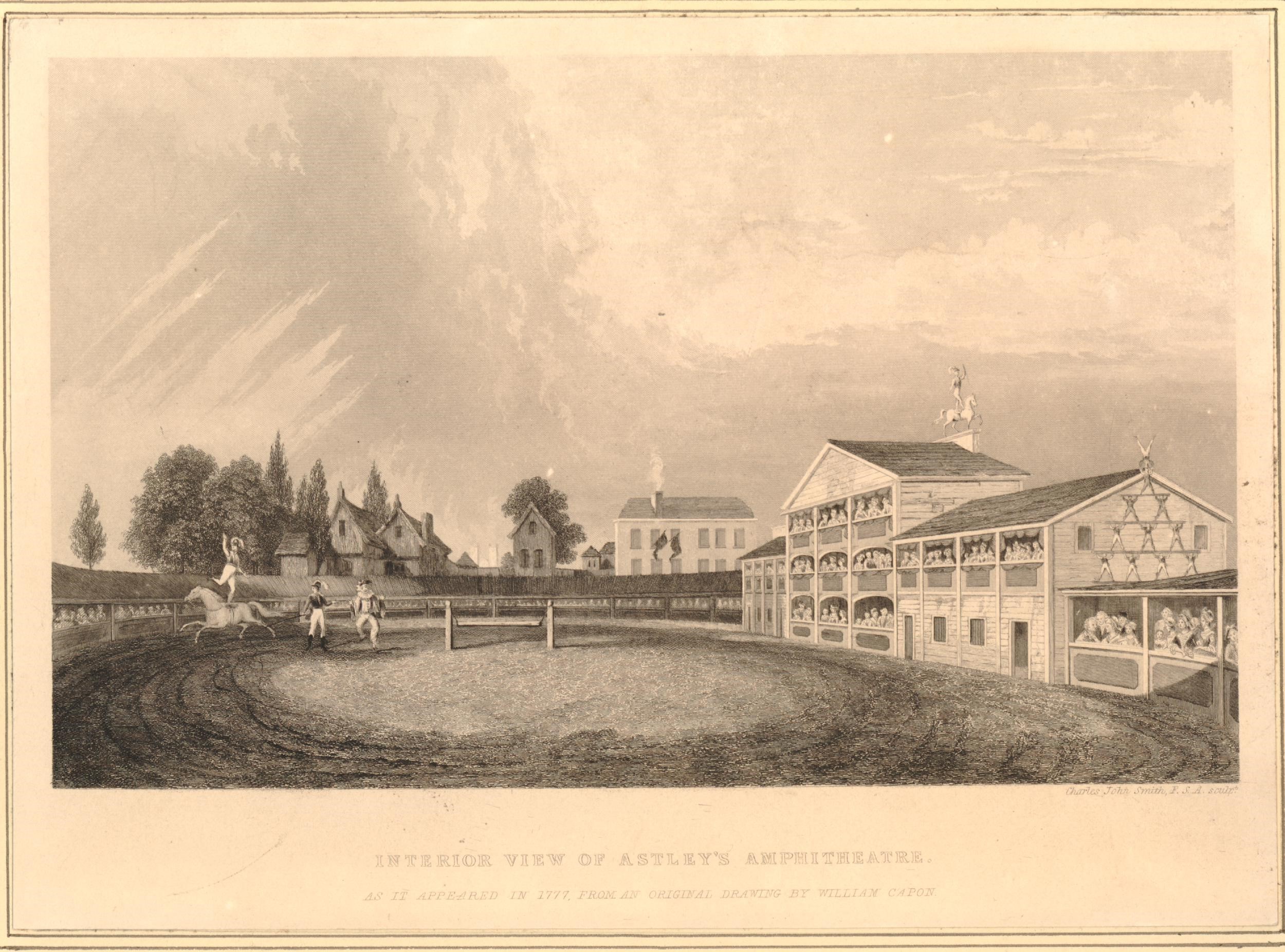 애슬리는 원형 경기장(링)을 고안하여 공연을 더 효과적으로 만들었다. 원형 링은 관객들이 기수를 더 잘 볼 수 있게 해 주었고, 원심력을 이용하여 기수들이 묘기를 부리기 쉽게 했다.[8] 애슬리는 자신의 공연장을 '서커스'라고 부르지 않았는데, 이 명칭은 그의 경쟁자였던 찰스 디브딘이 찰스 휴즈와 함께 1782년 11월 4일 런던 램버스에 '로열 서커스'를 개장하면서 처음 사용되었다.[8][9]