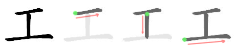 일본어 표준에서는, 세로 획이 가장 낮은 가로 획을 통과하지 않는 경우, 많은 교차하는 가로 획보다 먼저 세로 획을 쓸 수 있다.